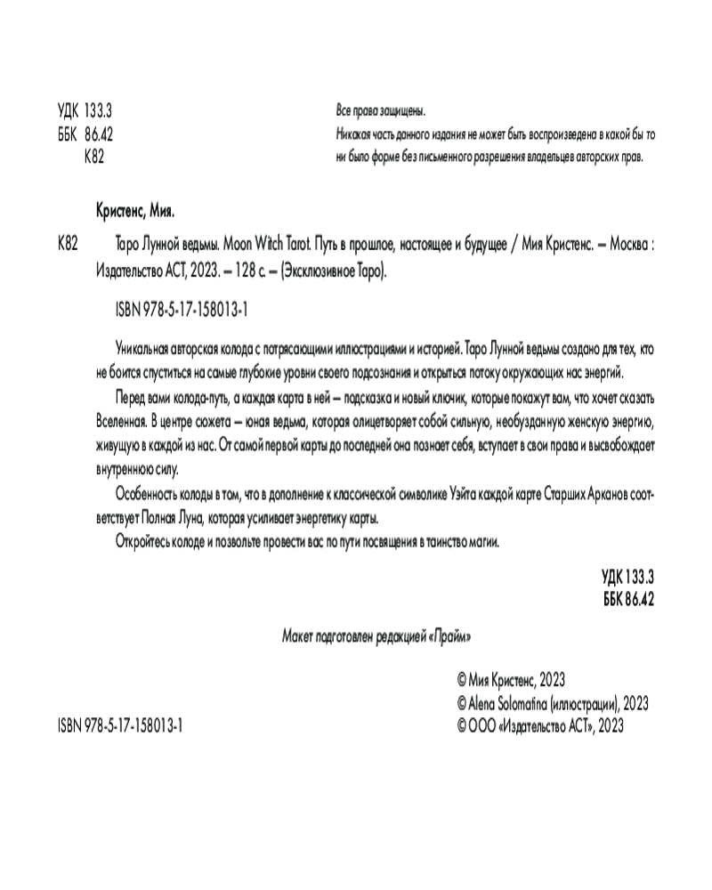 Чтобы почувствовать свой магический дар, пройдите путь с колодой Moon Witch Tarot. Каждая карта будет следующим шагом к истинному освобождению и познанию себя. На пути вас будут сопровождать верный защитник Волк, как символ дикой сущности, и Луна — мать, что бережно следит за детьми, но не вмешивается, давая им возможность самим пройти уроки жизни.