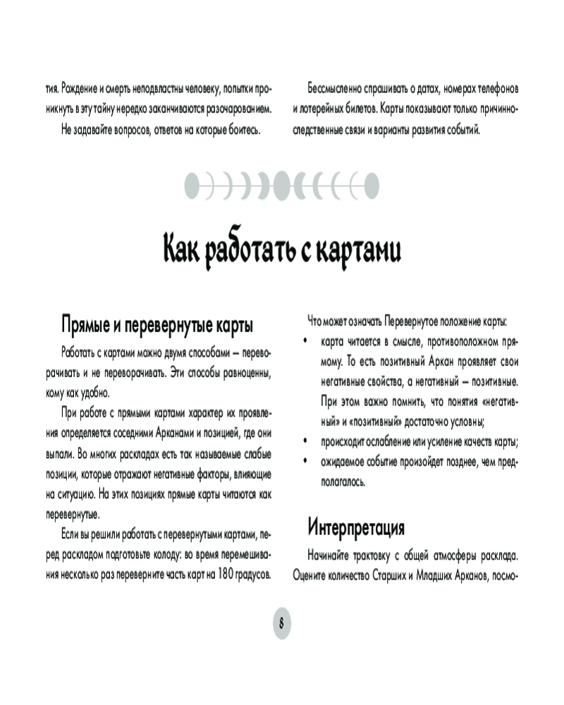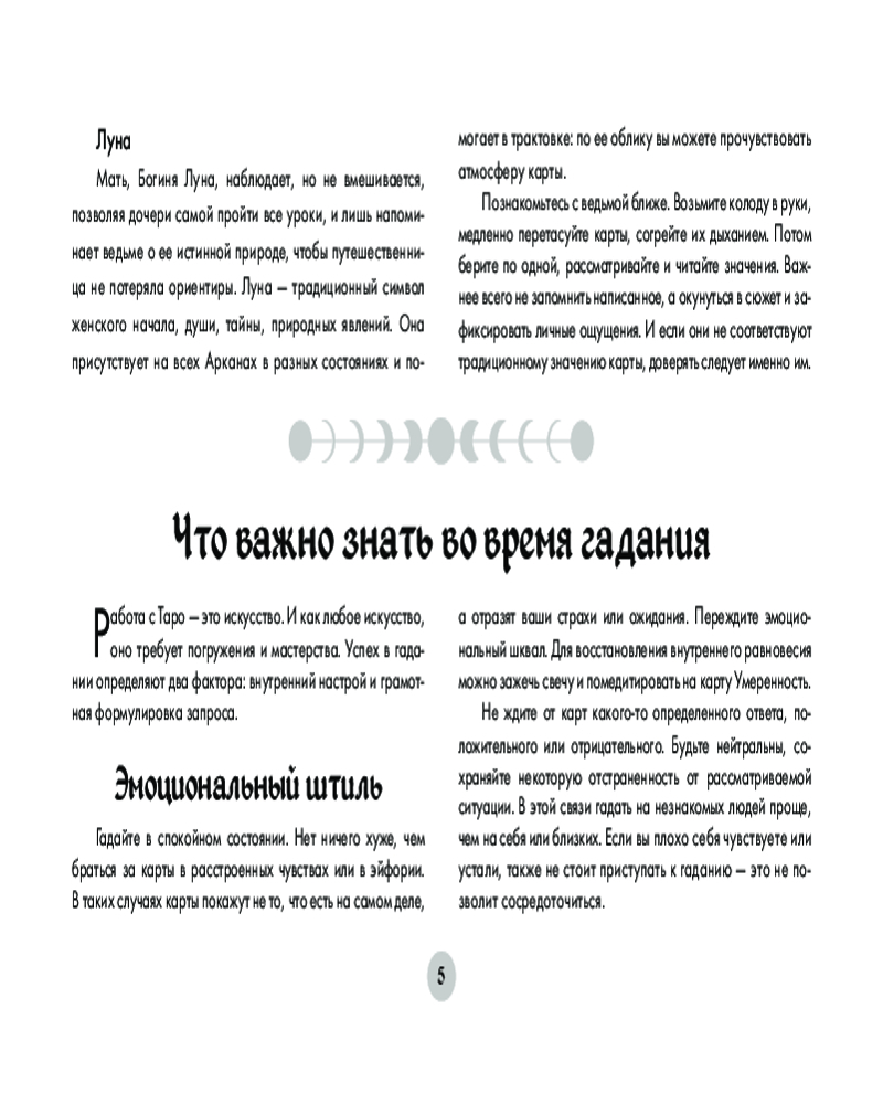 Особенность колоды в том, что в дополнение к классической символике и значениям Уэйта каждой карте Старших Арканов соответствует та или иная Полная Луна, которая усиливает энергетику карты.