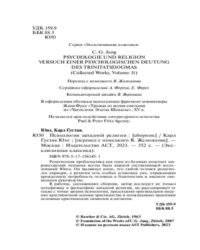 В данный момент этот товар отсутствует в продаже. Возможно, у нас найдется аналогичный или похожий товар здесь. Серия: Эксклюзивная классика Религиозная проблематика как одна из базовых констант мировоззрения человека всегда была важной составляющей исследований Юнга. Он выдвинул идею, что любой человек религиозен априори, а религия есть особая установка ума, отражающая врожденную потребность человека в благочестии и высшем священном руководстве.