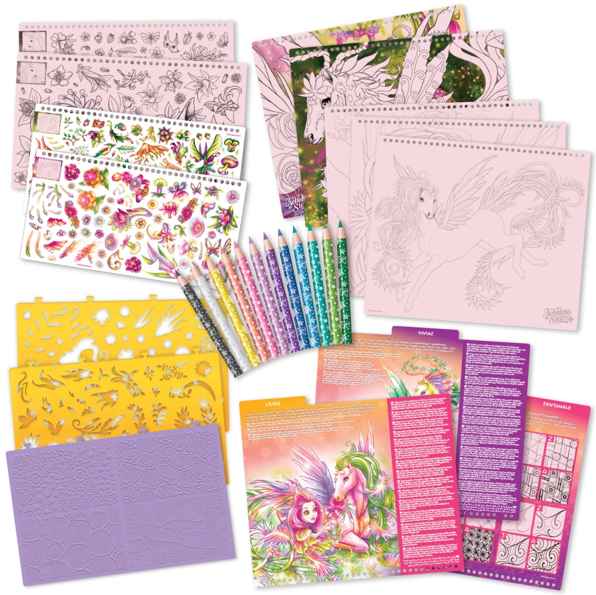 Раскрашивание и декорирование рисунков с помощью трафаретов, цветных наклеек, специальных техник рисования и цветных карандашей. Создание альбома единорогов.К набору прилагается подробная инструкция и буклет с историей единорогов Lilyaz и Viviaz.