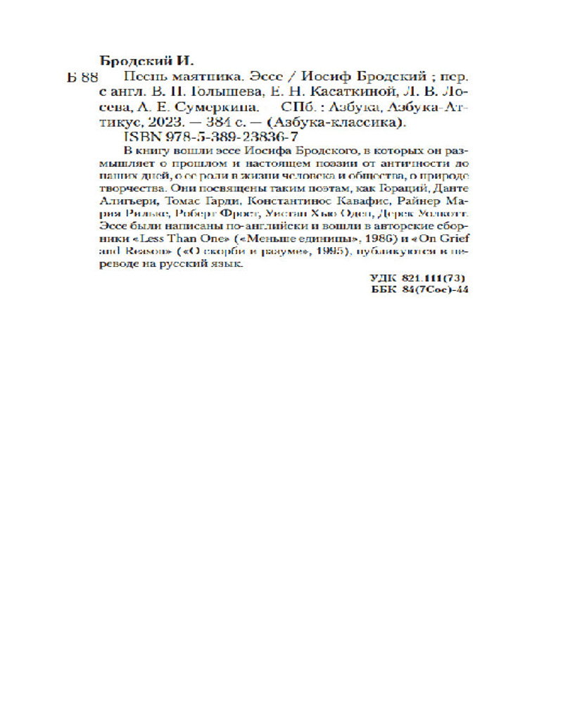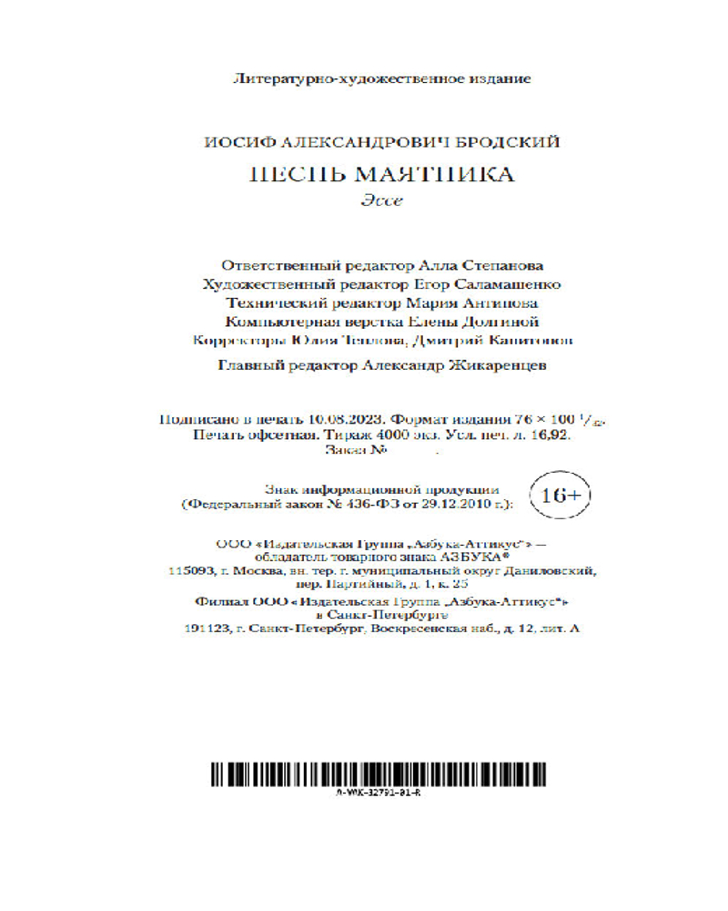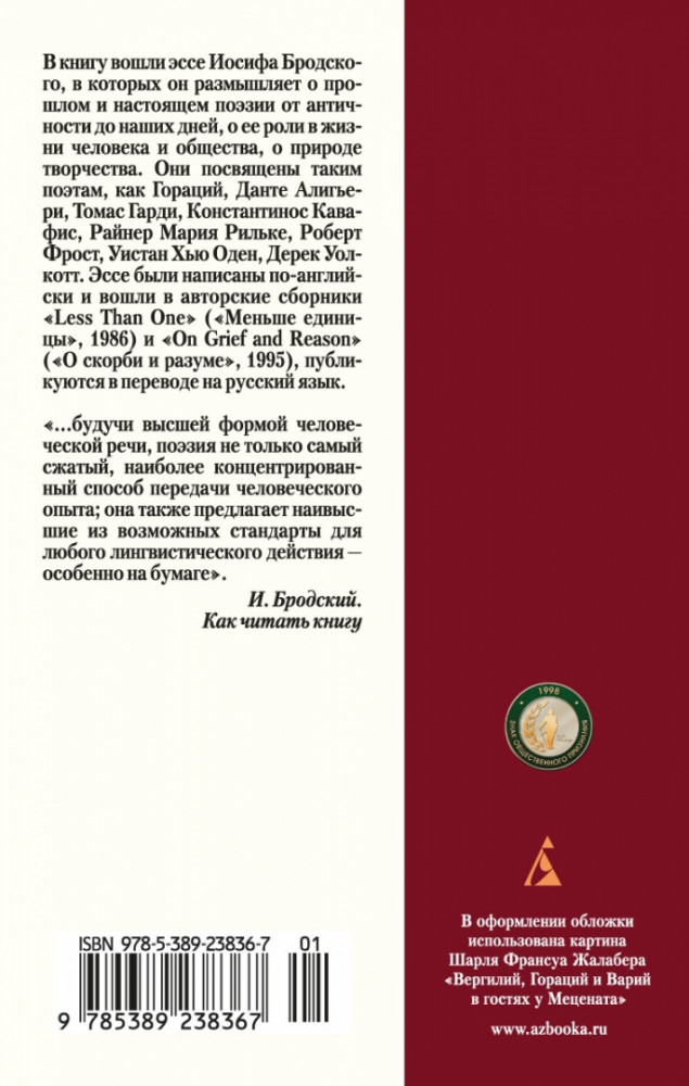Серия: Азбука-классика (pocket-book) В книгу вошли эссе Иосифа Бродского, в которых он размышляет о прошлом и настоящем поэзии от античности до наших дней, о ее роли в жизни человека и общества, о природе творчества. Они посвящены таким поэтам, как Гораций, Данте Алигьери, Томас Гарди, Константинос Кавафис, Райнер Мария Рильке, Роберт Фрост, Уистан Хью Оден, Дерек Уолкотт. Эссе были написаны по-английски и вошли в авторские сборники «Less Than One» («Меньше единицы», 1986) и «On Grief and Reason» («О скорби и разуме», 1995), публикуются в переводе на русский язык. |