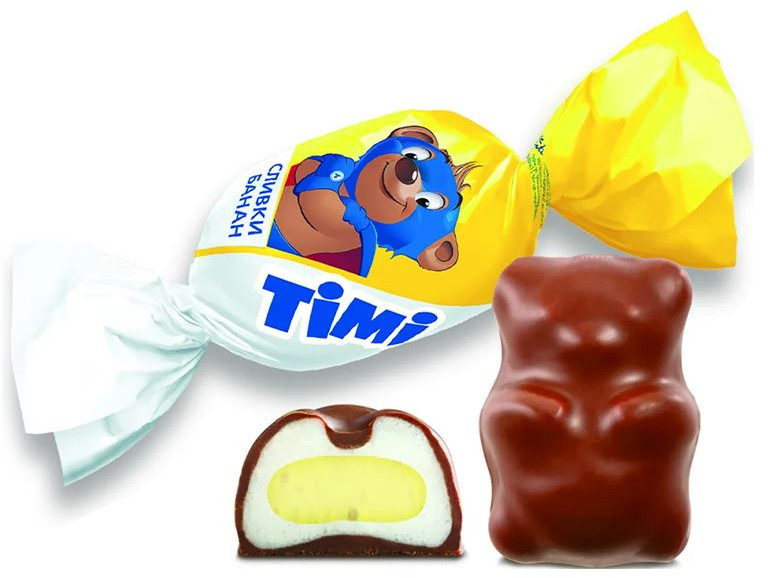 Сахар, патока крахмальная кукурузная, продукт молокосодержащий сгущенный с сахаром с заменителем молочного жира с м.д.ж. 5,0 %, в том числе молочного жира в жировой фазе не менее 50 % (молоко цельное, молоко обезжиренное, сахар, лактоза, заменитель молочного жира (рафинированные дезодорированные растительные масла: пальмовое и его фракции, подсолнечное, соевое, рапсовое; эмульгатор моно- и диглицериды жирных кислот; антиокислитель токоферолы, концентрат смеси), молоко сухое обезжиренное, сыворотка молочная сухая), какао тертое, заменитель молочного жира (рафинированные дезодорированные растительные масла: пальмовое и его фракции, подсолнечное; антиокислитель токоферолы, концентрат смеси), заменители сухого молока м.д.ж. 25 %, 1,5 % (молоко сухое обезжиренное, концентрат сывороточно-жировой сухой (сыворотка сухая молочная, рафинированные дезодорированные растительные масла: пальмовое, соевое, рапсовое, пальмоядровое; эмульгаторы: моно- и диглицериды жирных кислот, лецитин соевый)), эквивалент масла какао (рафинированные дезодорированные растительные масла: пальмовое, ши, эллипе), агент влагоудерживающий сорбит, агент желирующий агар, продукты яичные, молоко сухое цельное, ароматизаторы, регулятор кислотности кислота лимонная, эмульгатор лецитин соевый, эмульгатор эфиры полиглицерина и взаимоэтерифицированных рециноловых кислот, краситель каротины, сливки сухие, банановое пюре. Может содержать следы диоксида серы.