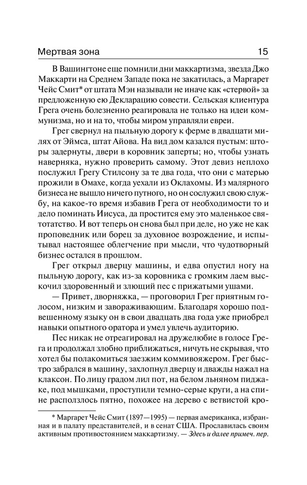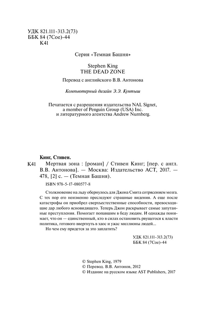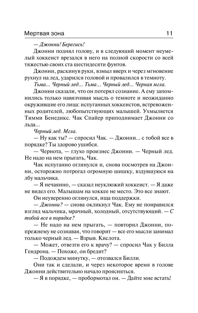 Мертвая зонаВ данный момент этот товар отсутствует в продаже. Возможно, у нас найдется аналогичный или похожий товар здесь. Столкновение на льду обернулось для Джона Смита сотрясением мозга. С тех пор его неизменно преследуют страшные видения. А еще после катастрофы он приобрел сверхъестественные способности, превосходящие дар любого ясновидящего. Теперь Джон раскрывает самые запуганные преступления. Помогает попавшим в беду людям. И однажды понимает, что он — единственный, кто в силах остановить рвущегося к власти политика, готового ввергнуть в хаос и ужас миллионы людей… Но чем ему придется за это заплатить? |