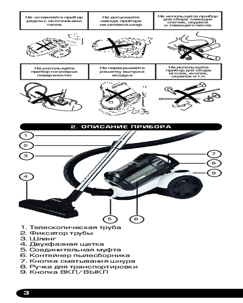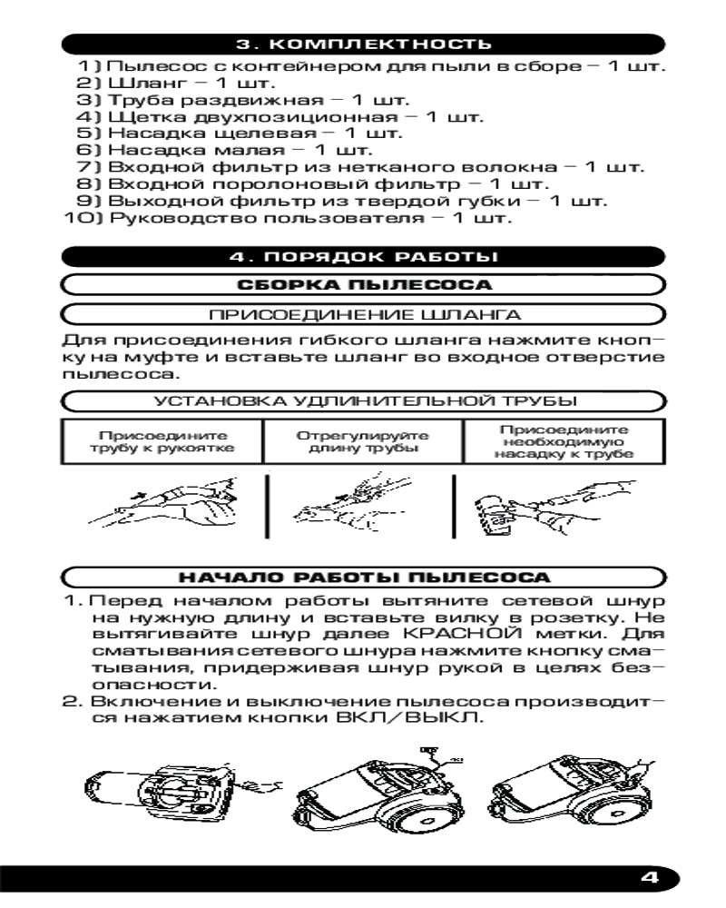 пылесос — 1 шт.; малая насадка — 1 шт.; щелевая насадка — 1 шт; шетка двухпозиционная 1 шт.; руководство пользователя — 1 шт.