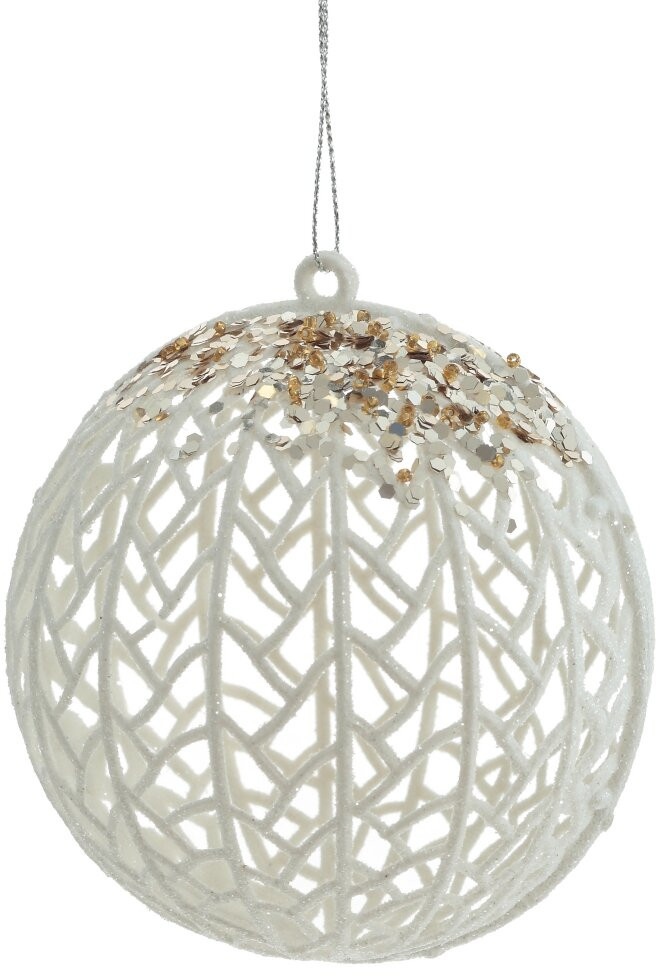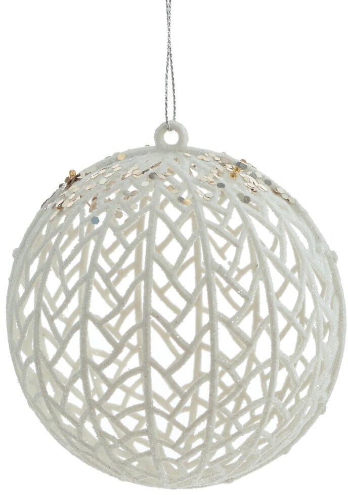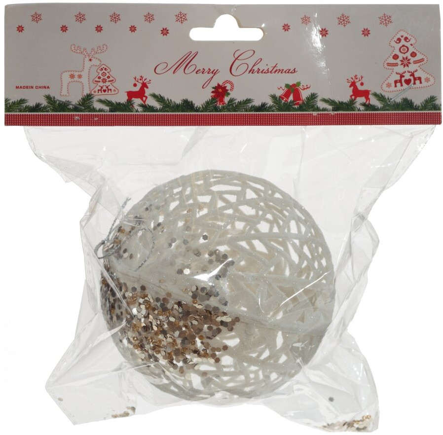 Серия: Новогодний декор «Новогоднее золото» Ажурный шар белого цвета с искристым напылением. Глиттер придает украшению яркости и блеска. Великолепно гармонирует с любым убранством новогодней ели. |
