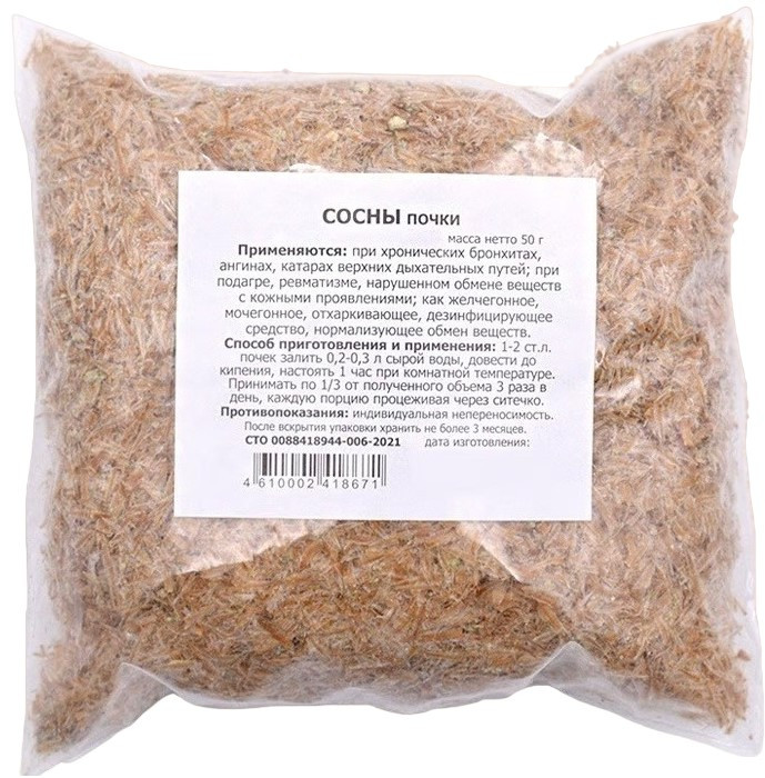 Почки сосны используются в медицине как отхаркивающее и дезинфицирующее средство при лечении болезней верхних путей дыхания. Как правило, такие лекарства имеют вид отваров для проведения ингаляций и настоев, которые рекомендуется употреблять внутрь при бронхите, пневмонии, язве двенадцатиперстной кишки и желудка. |