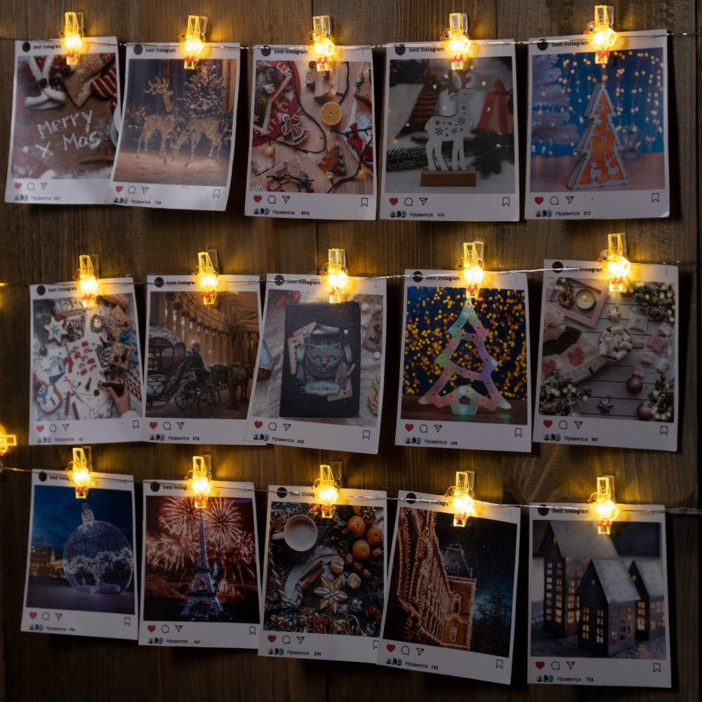 Обыычная металлическая нить с очень маленькими лампочками. Вся красота и практичность в прищепках с циплятами. В доставленной гирлянде не хватало одной прищепки.