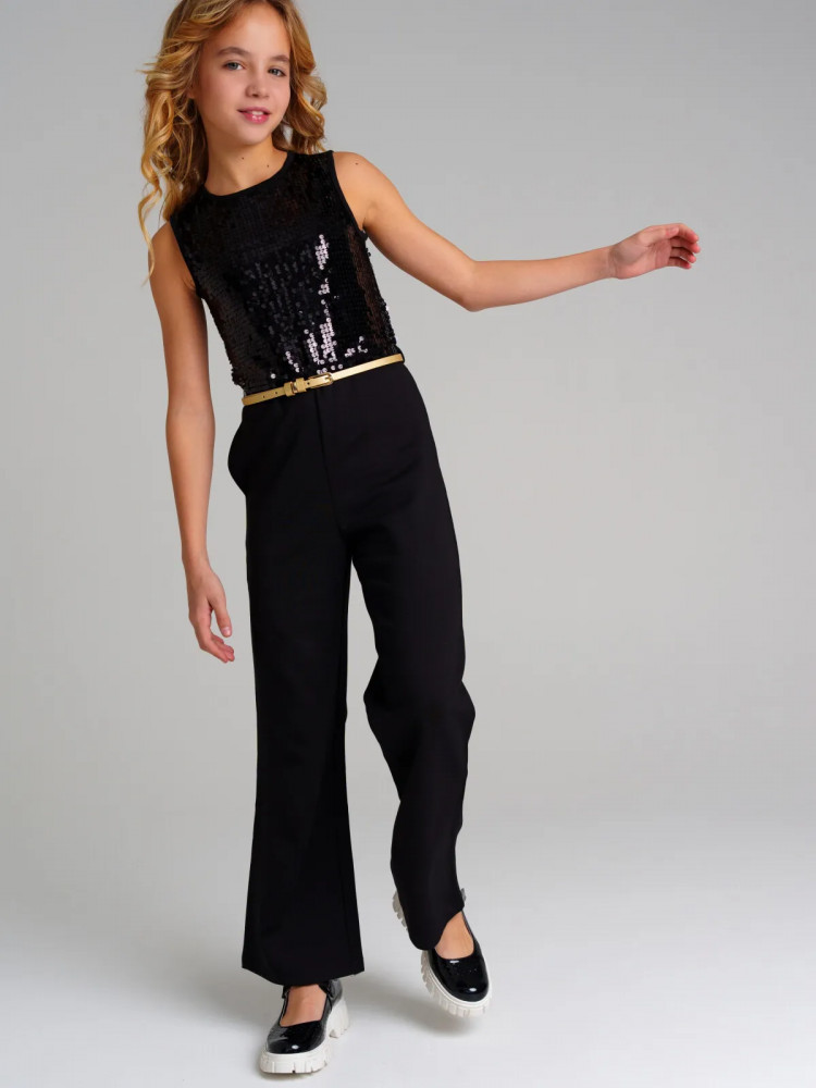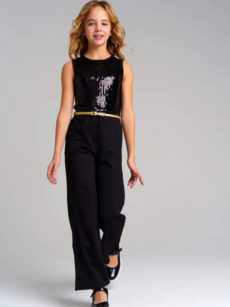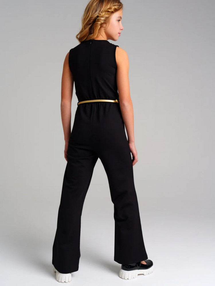 Комбинезон из плотного трикотажного полотна. Мягкий, эластичный материал, благодаря прочному плетению хорошо держит форму, не мнется, не растягивается. Свободный крой брючин. Застежка сзади на потайную молнию. Декор из сетки.