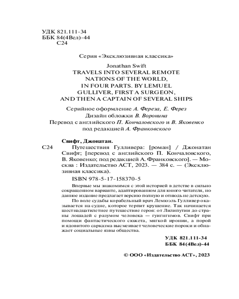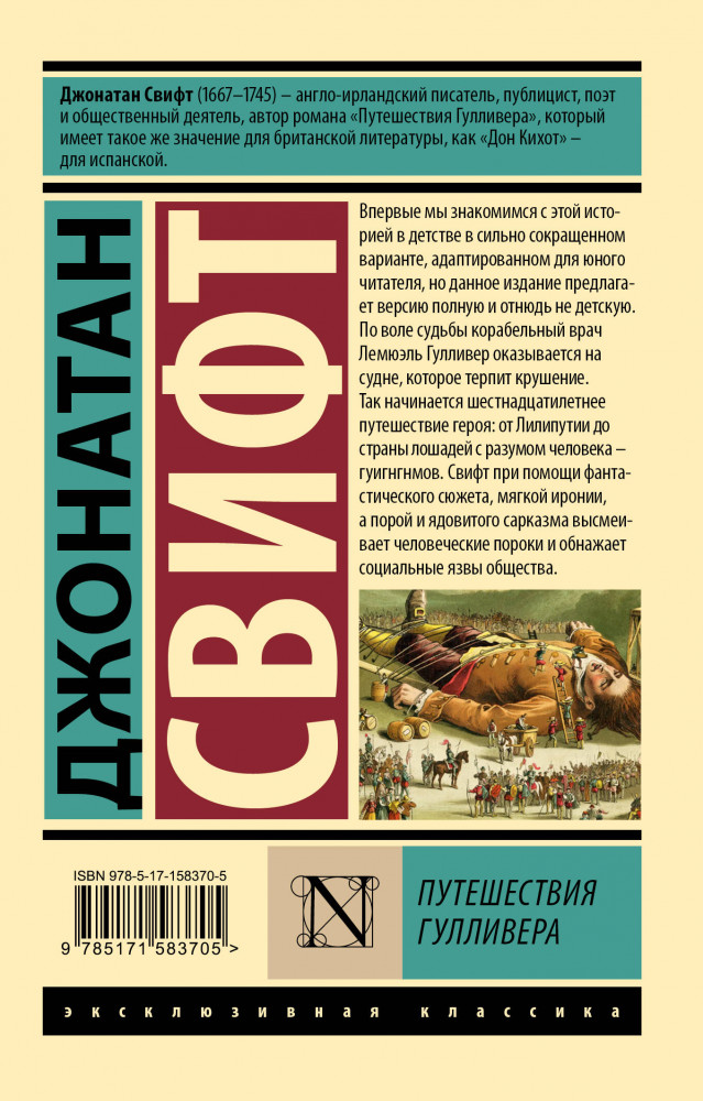 Путешествия ГулливераВ данный момент этот товар отсутствует в продаже. Возможно, у нас найдется аналогичный или похожий товар здесь. Серия: Эксклюзивная классика Впервые мы знакомимся с этой историей в детстве в сильно сокращенном варианте, адаптированном для юного читателя, но данное издание предлагает версию полную и отнюдь не детскую. |