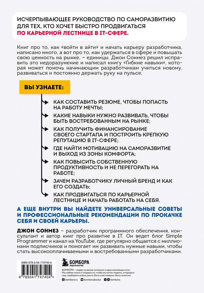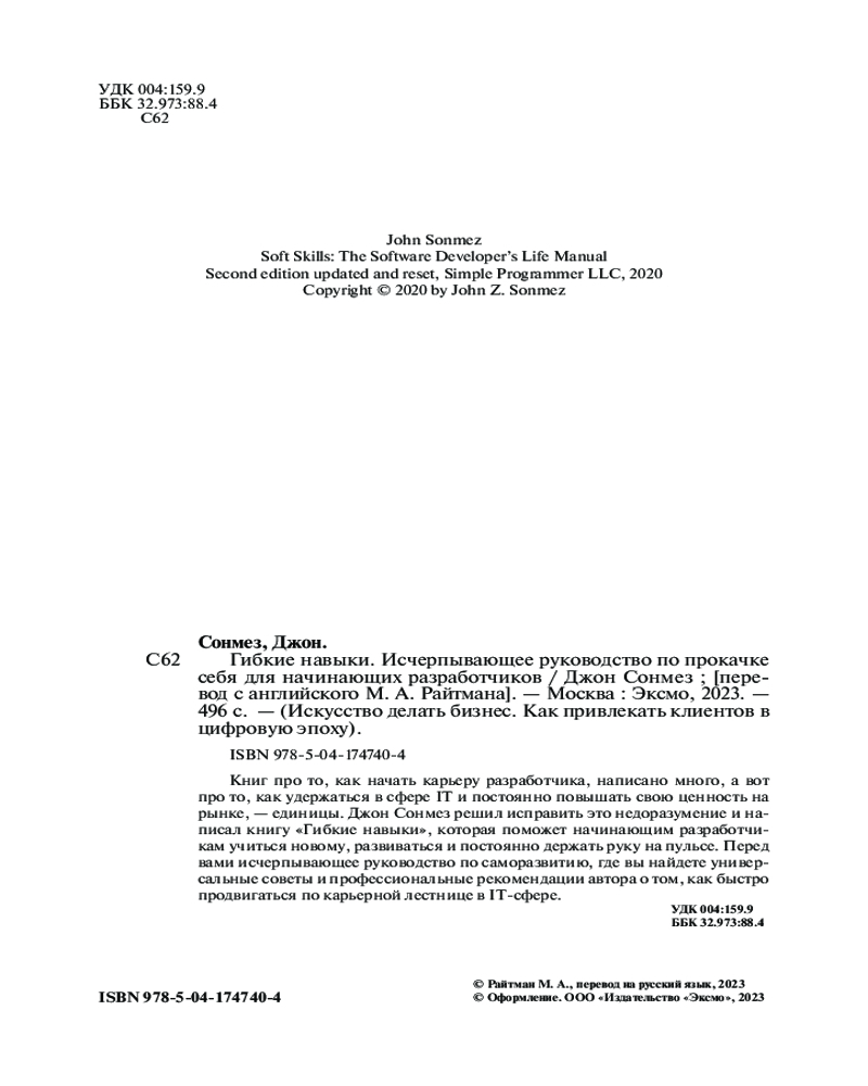 💳 Оплатить за товар можно при получении 🇰🇿 Есть бесплатная доставка по Казахстану от 1 дня 🎁 Копите бонусы с каждой покупки Серия: Искусство делать бизнес. Как привлекать клиентов в цифровую эпоху Исчерпывающее руководство по саморазвитию для тех, кто хочет быстро продвигаться по карьерной лестнице в IT-сфере. Книг про то, как «войти в айти» и начать карьеру разработчика, написано много, а вот про то, как удержаться в сфере и повышать свою ценность на рынке — единицы. Джон Сонмез решил исправить это недоразумение и написал книгу «Гибкие навыки», которая может помочь начинающим разработчикам учиться новому, развиваться и постоянно держать руку на пульсе. |
