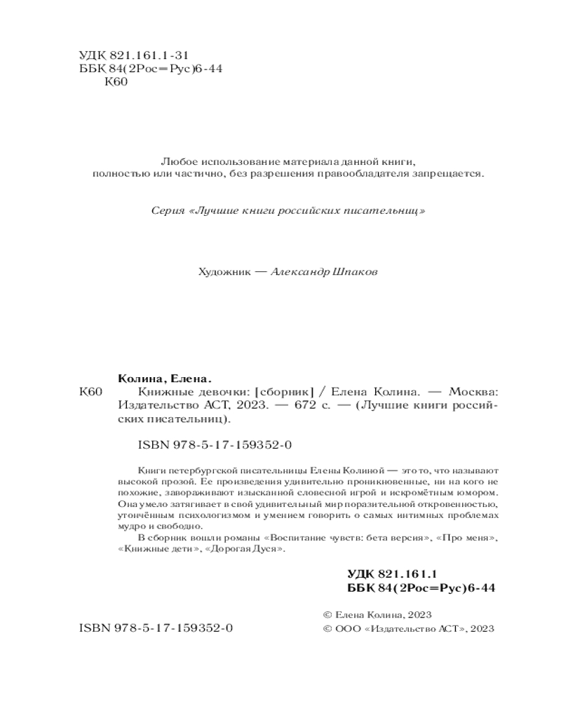 💳 Оплатить за товар можно при получении 🇰🇿 Есть бесплатная доставка по Казахстану от 1 дня 🎁 Копите бонусы с каждой покупки Серия: Лучшие книги российских писательниц Книги петербургской писательницы Елены Колиной — это то, что называют высокой прозой. Ее произведения удивительно проникновенные, ни на кого не похожие, завораживают изысканной словесной игрой и искромётным юмором. Она умело затягивает в свой удивительный мир поразительной откровенностью, утончённым психологизмом и умением говорить о самых интимных проблемах мудро и свободно. |