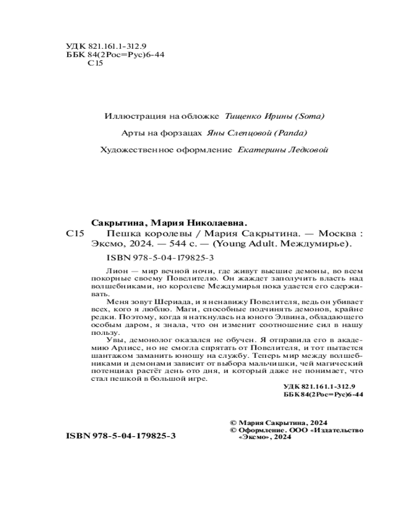 💳 Оплатить за товар можно при получении 🇰🇿 Есть бесплатная доставка по Казахстану от 1 дня 🎁 Копите бонусы с каждой покупки Серия: Young Adult. Междумирье Завершающая часть дилогии «Междумирье» от Марии Сакрытиной! Увлекательное темное фэнтези о демонологе Элвине, поставленном перед ужасным выбором! Атмосферное чтение для всех любителей жанра dark academia! Запечатанные форзацы с персонажами романа! Под обложкой этой истории вас ждут: магические поединки, две любовные линии, интриги, заговоры и предательства, а также мрачная готическая атмосфера, приправленная юмором и уютными застольями! Лион — мир вечной ночи, где живут высшие демоны, во всем покорные своему Повелителю. Он жаждет заполучить власть над волшебниками, но королеве Междумирья пока удается его сдерживать. |
