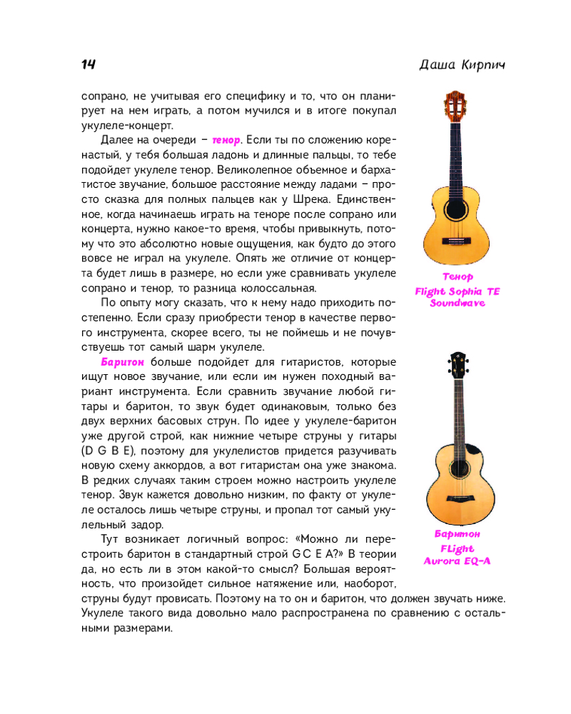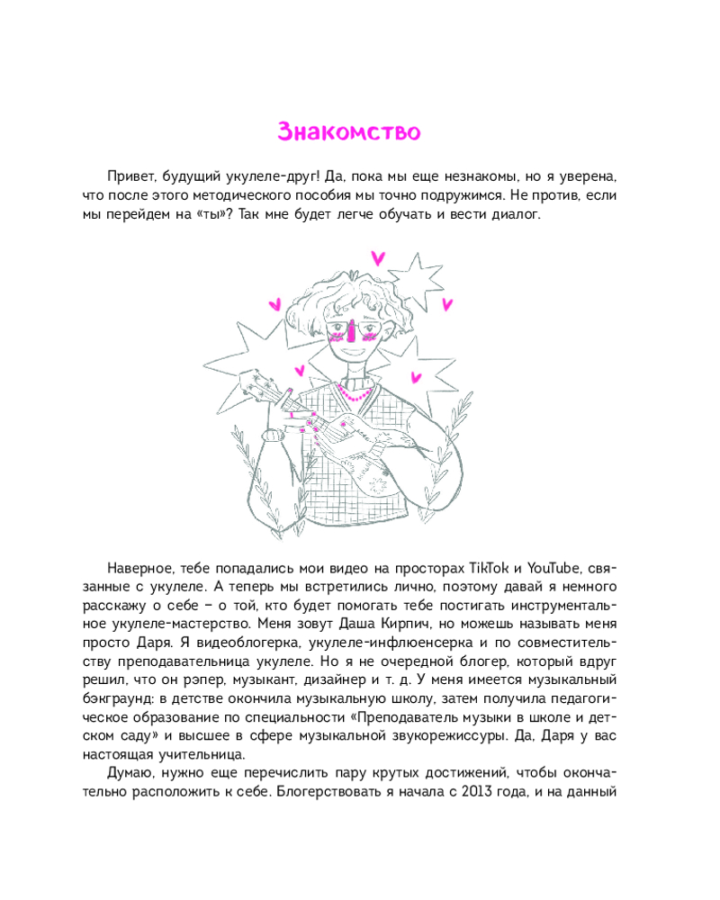 В данный момент этот товар отсутствует в продаже. Возможно, у нас найдется аналогичный или похожий товар здесь. Серия: Подарочные издания. Самоучители Укулеле — один из самых демократичных и доступных инструментов. И прежде всего он подкупает возможностью аккомпанировать любимым песням. Профессиональная музыкантка, блогерка и преподавательница Даша Кирпич расскажет тебе, как легко и быстро освоить инструментальную игру на укулеле. После изучения этой книги ты не только разучишь аккорды и ноты, но и узнаешь азы музыкальной теории, изучишь расположение нот на инструменте и выучишь сложные техники, баррэ, переборы и т.д. В конце книги, как и раньше, находятся словарь терминов и укутрекер для отслеживания прогресса.