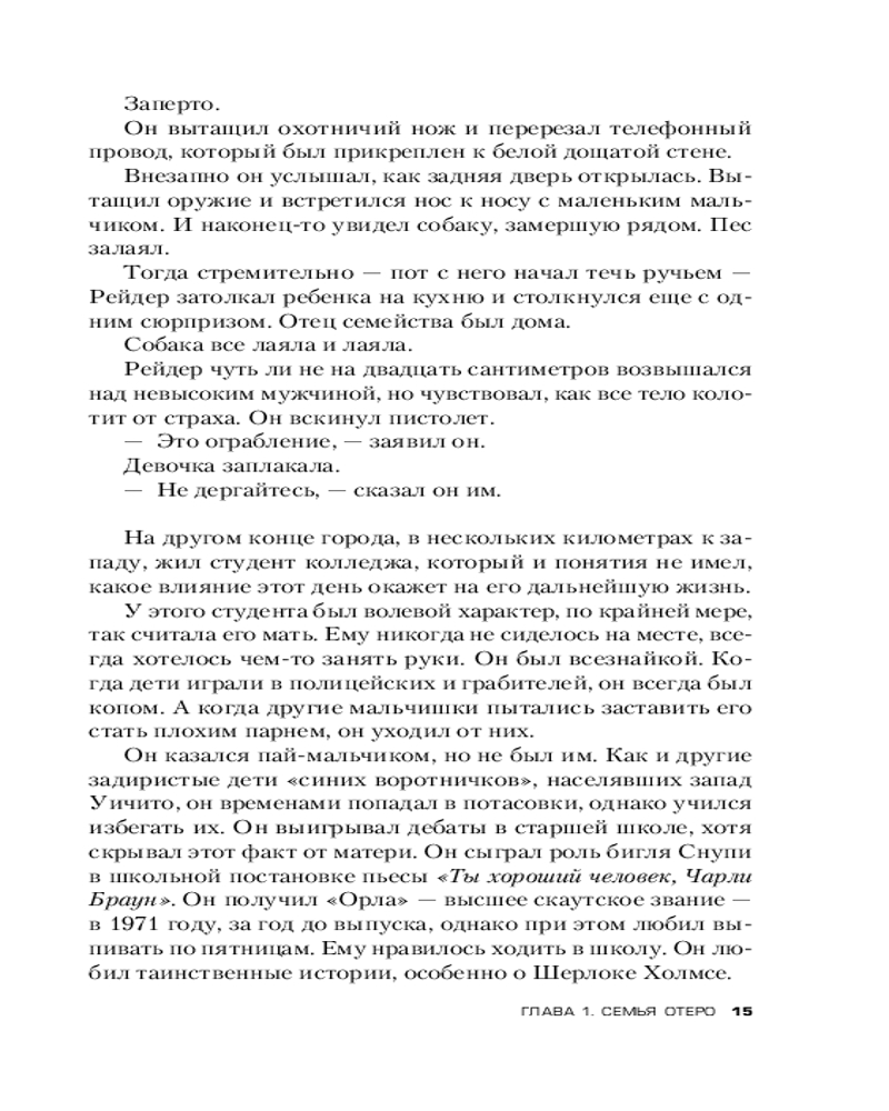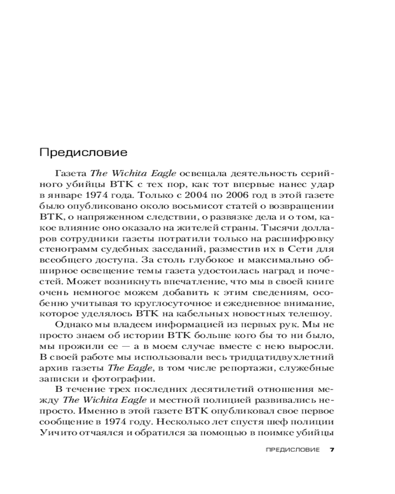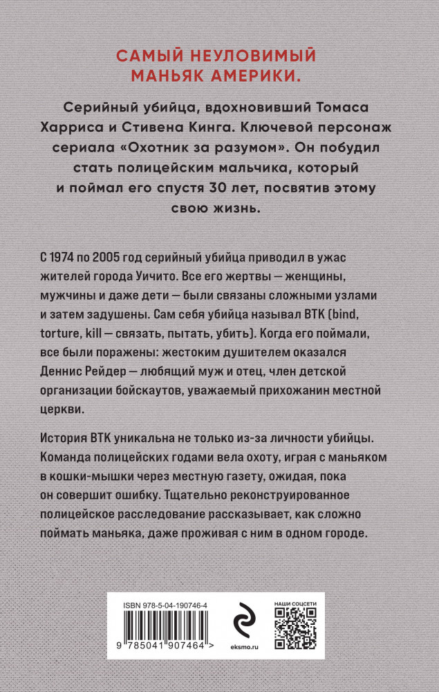 История BTK уникальна не только личностью маньяка. В 1970-х, когда начались первые громкие убийства душителя, Кенни Ландвер был местным подростком. Впечатлительный мальчик захотел стать полицейским, чтобы охотиться на таких вот убийц и подонков. Никто и не подозревал, что именно он спустя 30 лет поймает BTK, посвятив этому делу всю свою профессиональную жизнь. Ландвер годами играл с маньяком в «кошки-мышки», ожидая, пока тот совершит ошибку. Тщательно реконструированное полицейское расследование, лежащее в основе книги, рассказывает, как сложно поймать серийного убийцу, даже проживая с ним в одном городе. |