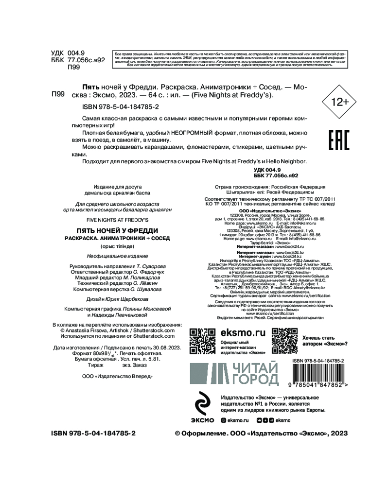 Пять ночей у Фредди. Аниматроники + Сосед. РаскраскаВ данный момент этот товар отсутствует в продаже. Возможно, у нас найдется аналогичный или похожий товар здесь. Серия: Five Nights at Freddy's Лучшие раскраски! Каждому фанату FNAF. Тем, кто играл во Five Nights at Freddy’s и Hello Neighbor. Плотная белая бумага, удобный формат, можно взять в дорогу, останется в целости. 64 страницы раскрасок! Хватит надолго. Можно раскрашивать карандашами, фломастерами, стикерами, цветными ручками. Подходит для первого знакомства с миром компьютерных игр. Тем, кто читал другие книги про «Пять ночей у Фредди» и «Привет, сосед!». Самая классная раскраска с самыми известными и популярными героями компьютерных игр! Плотная белая бумага, удобный неогромный формат, плотная обложка, можно взять в поезд, в самолёт, в машину. Подходит для первого знакомства с миром Five Nights at Freddy’s и Hello Neighbor. |
