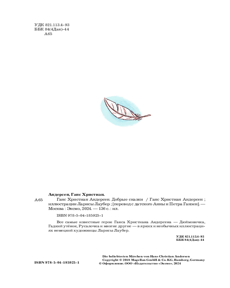 💳 Оплатить за товар можно при получении 🇰🇿 Есть бесплатная доставка по Казахстану 🎁 Копите бонусы с каждой покупки Серия: Золотые сказки для детей Самые популярные персонажи Ганса Христиана Андерсена — Дюймовочка, Гадкий утёнок, Русалочка и многие другие — нашли своё место в книге добрых сказок. В сборник вошли восемь сказок в классическом переводе Анны и Петра Ганзен. Герои в исполнении немецкой художницы Ларисы Лаубер приобрели динамичность и выразительность, близкие и понятные современным детям. Яркие и забавные иллюстрации, похожие на кадры из мультфильмов, стали отличительной чертой стиля Лаубер. |