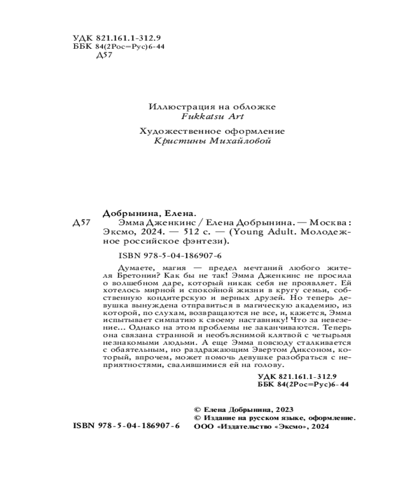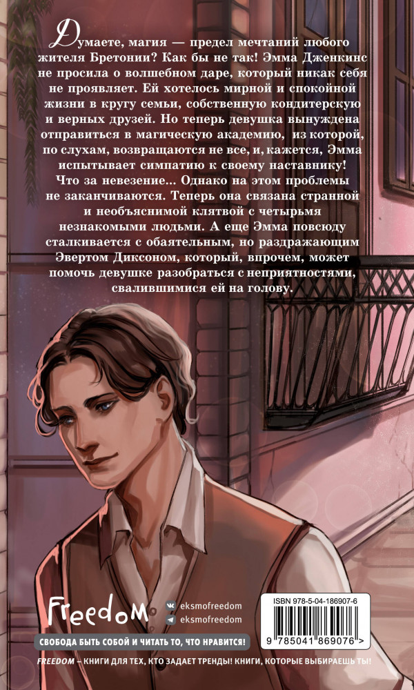 Эмма ДженкинсВ данный момент этот товар отсутствует в продаже. Возможно, у нас найдется аналогичный или похожий товар здесь. Серия: Young Adult. Молодежное российское фэнтези Думаете, магия — предел мечтаний любого жителя Бретонии? Как бы не так! Эмма Дженкинс не просила о волшебном даре, который никак себя не проявляет. Ей хотелось мирной и спокойной жизни в кругу семьи, собственную кондитерскую и верных друзей. Но теперь девушка вынуждена отправиться в магическую академию, из которой, по слухам, возвращаются не все, и, кажется, Эмма испытывает симпатию к своему наставнику! Что за невезение... Однако на этом проблемы не заканчиваются. Теперь она связана странной и необъяснимой клятвой с четырьмя незнакомыми людьми. А еще Эмма повсюду сталкивается с обаятельным, но раздражающим Эвертом Диксоном, который, впрочем, может помочь девушке разобраться с неприятностями, свалившимися ей на голову. |