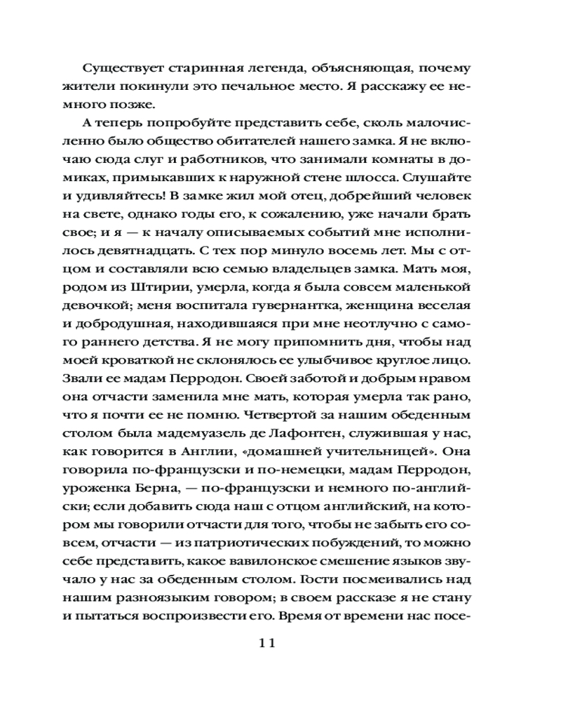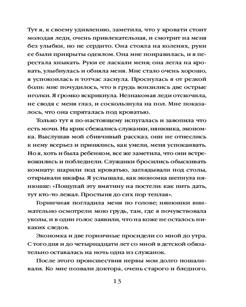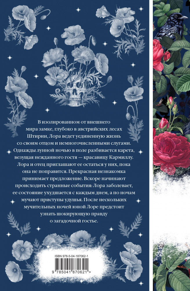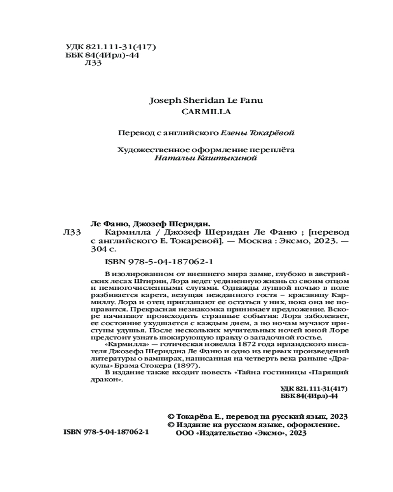 Минусов больше в этой книге чем плюсов. Содержание отрывистое, да еще там оказалось две истории а не одна как написано на обложке «Кармилла». Вторая история оказалась к моему удивлению более интересней чем «Кармилла»(в ней слишком быстро развивались события, не описывалась обстановка и чувства персонажей, как будто написали наспех и отправили в редакцию на скорую руку). Самый огромнейший недостаток был что через каждые 10-20 страниц были опечатки, и орфографические ошибки что не допустимо для «Элегантной классики». Первая история ничем и никак не зацепила, в середине истории ожидалось хоть чего нибудь этенького , но к сожалению полное разочарование. Во второй истории более менее развёрнуты персонажи, их как раз таки показали с разных сторон, почувствовалась смысловая нагрузка. И к моему полному разочарованию, страницы были помяты, где-то было порвано даже, уголочки особенно. Не могу сделать фотографии так как быстро избавилась и продала эту книгу. В частности подойдет для подростков.