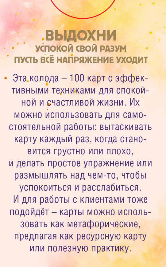 Всё пройдет. 100 карт с практиками для эмоционального баланса и избавления от стрессаВ данный момент этот товар отсутствует в продаже. Возможно, у нас найдется аналогичный или похожий товар здесь. Серия: Внутренняя опора. Метафорические карты для обретения счастья Обрети гармонию с картами «Все пройдет. 100 карт для сохранения внутреннего спокойствия в любой ситуации». Современный мир насыщен стрессовыми ситуациями, которые могут пошатнуть наше внутреннее равновесие. Но теперь есть решение — карты «Все пройдет». Этот магический набор из 100 уникальных карт специально разработан, чтобы помочь вам сохранить спокойствие и гармонию в любой ситуации. |