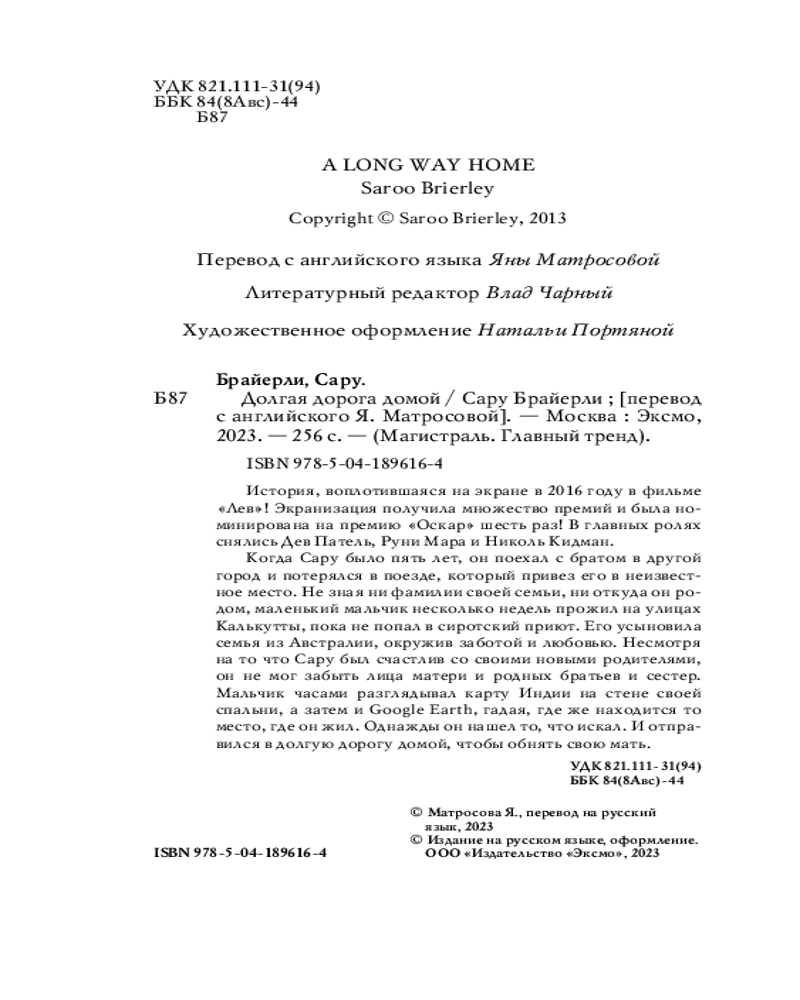 💳 Оплатить за товар можно при получении 🇰🇿 Есть бесплатная доставка по Казахстану от 1 дня 🎁 Копите бонусы с каждой покупки Серия: Магистраль. Главный тренд История, воплотившаяся на экране в 2016 году в фильме «Лев»! Экранизация получила множество премий и была номинирована на премию «Оскар» шесть раз! В главных ролях снялись Дев Патель, Руни Мара и Николь Кидман. |