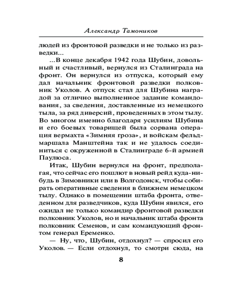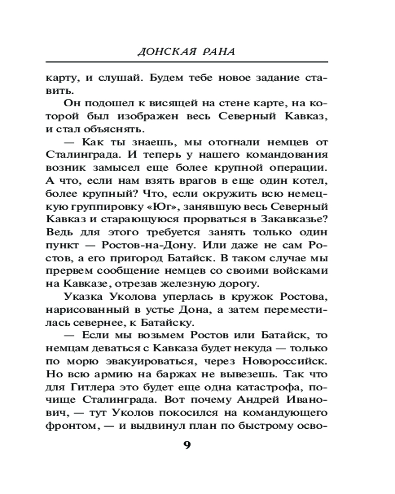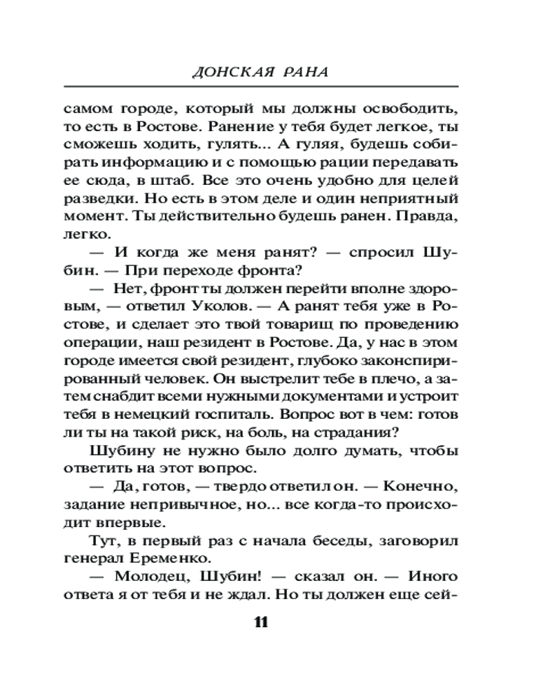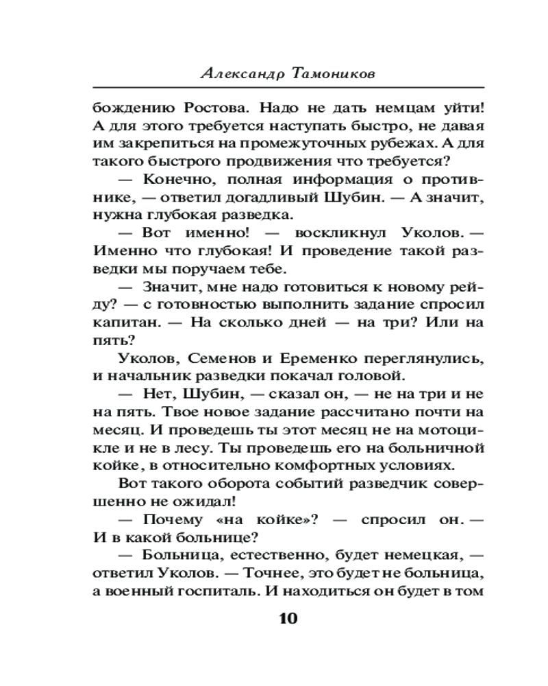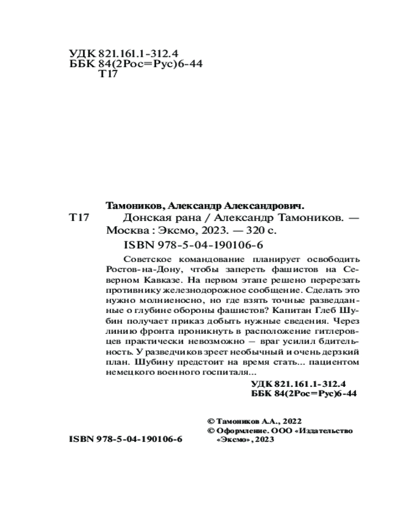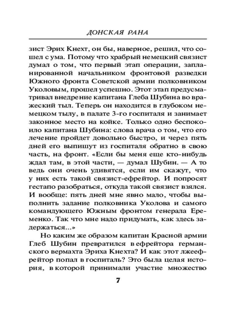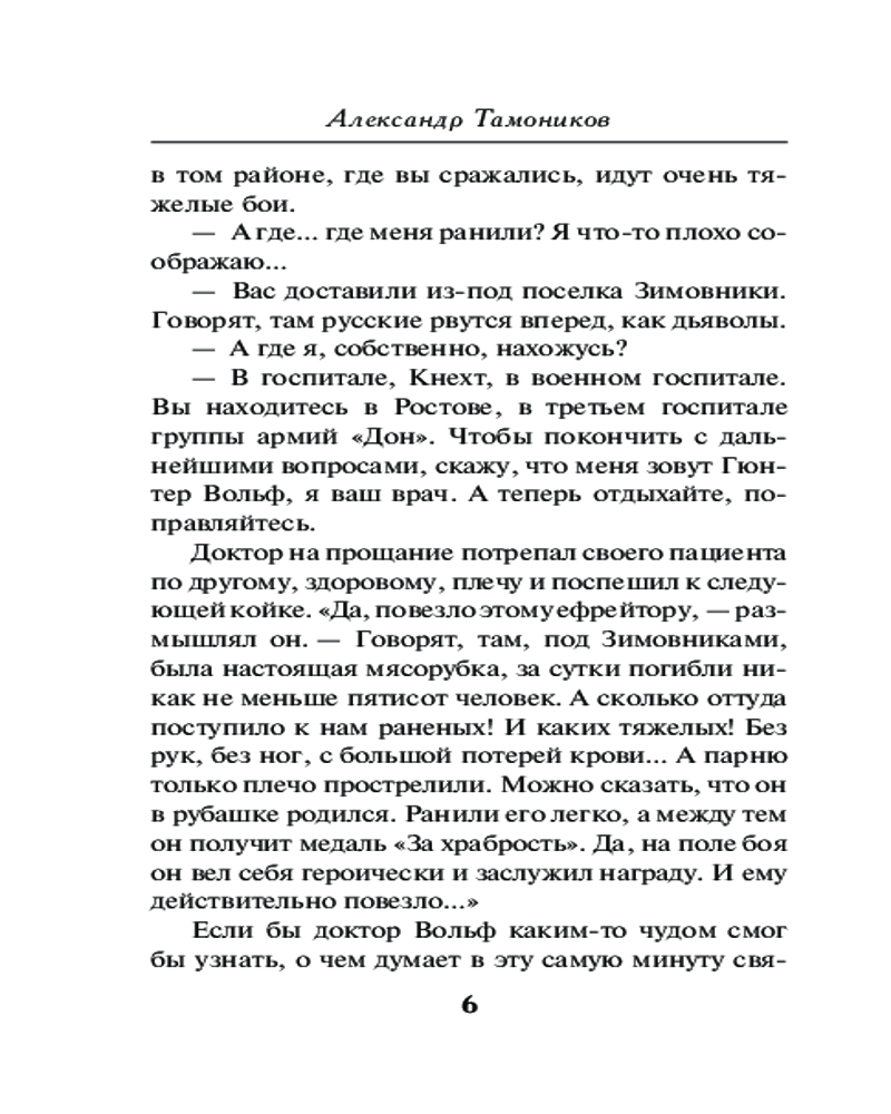 Донская ранаАлександр Александрович Тамоников В данный момент этот товар отсутствует в продаже. Возможно, у нас найдется аналогичный или похожий товар здесь. Серия: Фронтовая разведка 41-го. Боевая проза Тамоникова (обложка) Советское командование планирует освободить Ростов-на-Дону, чтобы запереть фашистов на Северном Кавказе. На первом этапе решено перерезать противнику железнодорожное сообщение. Сделать это нужно молниеносно, но где взять точные разведданные о глубине обороны фашистов? Капитан Глеб Шубин получает приказ добыть нужные сведения. Через линию фронта проникнуть в расположение гитлеровцев практически невозможно — враг усилил бдительность. У разведчиков зреет необычный и очень дерзкий план. Шубину предстоит на время стать... пациентом немецкого военного госпиталя... |