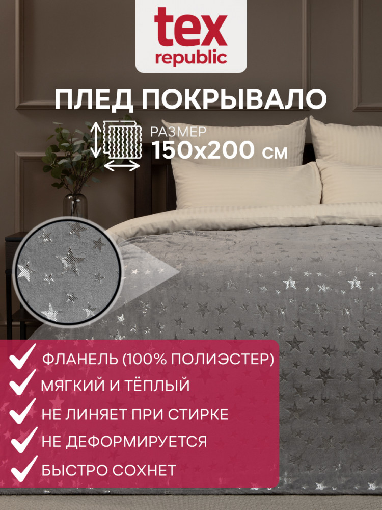 Пледы из фланели торговой марки «TexRepublic» — отличаются принципиально новым качеством ворса, обладающего исключительной мягкостью и шелковистостью! Яркие, легкие и необыкновенно мягкие. Разнообразие расцветок дает возможность добавить индивидуальности любому интерьеру. Ткань выполнена по новейшей технологии. Процесс расщепления волокна и дополнительные расчесывания делают эти пледы особенно воздушными и сохраняет опрятный внешний вид изделия в течение долгого времени. Отличительной особенностью пледов серии «Shick» является сдержанная цветовая гамма и классический узор, нанесенный краской металлик лазерным способом. На ощупь плед плотный, но при этом мягкий и не тяжелый, ворс не длинный.