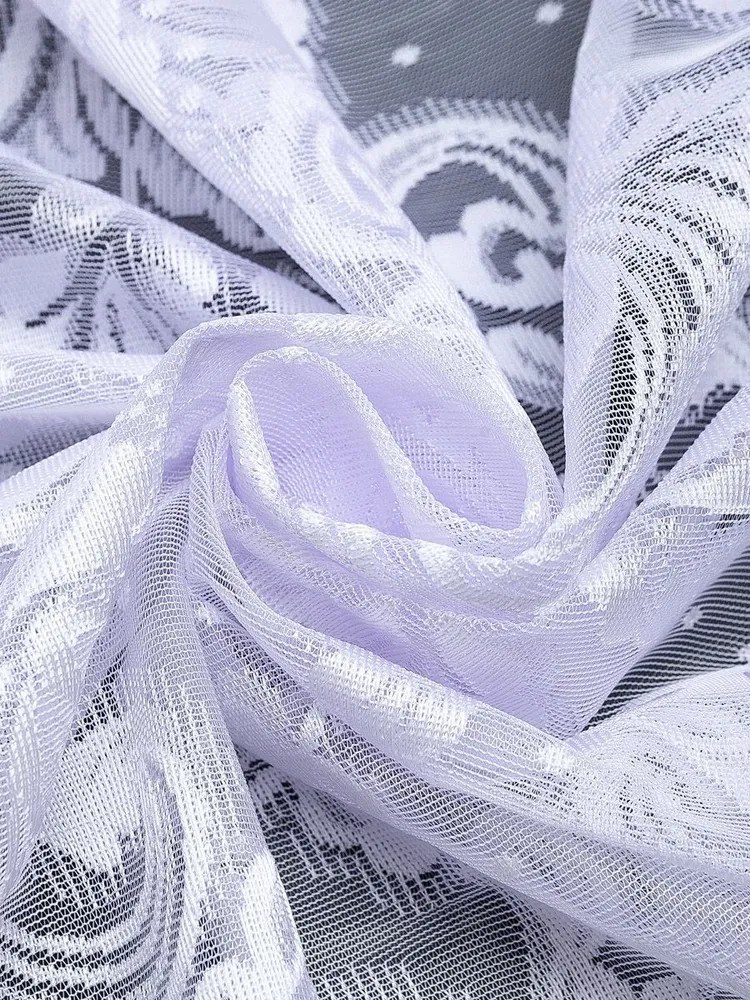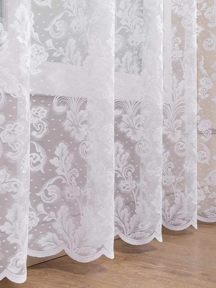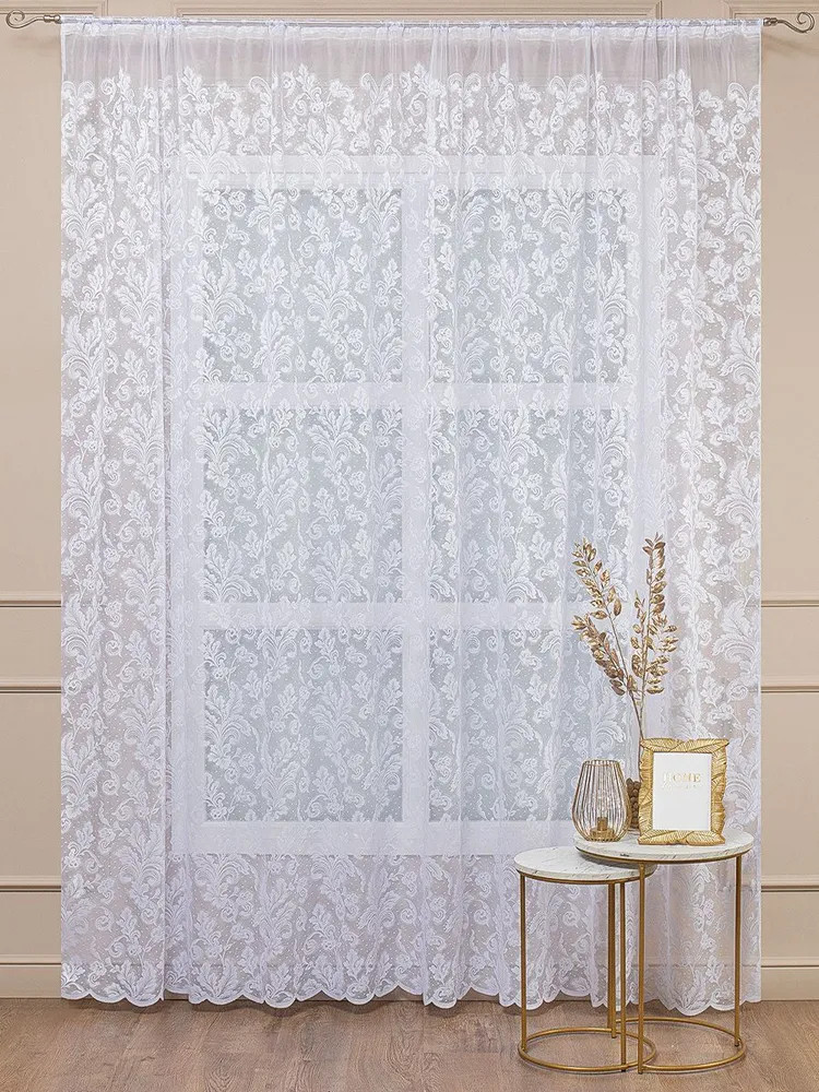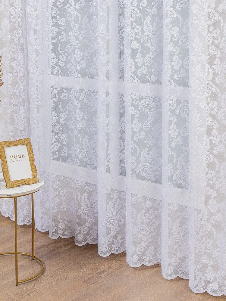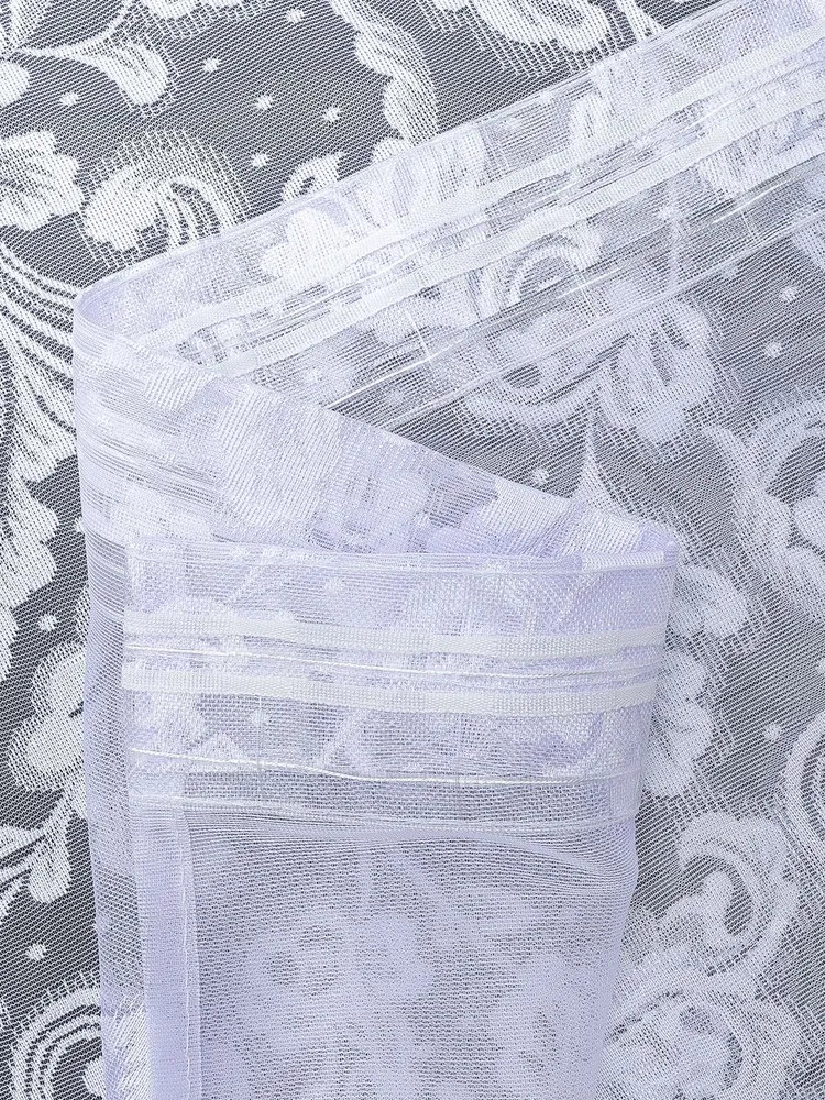 Белоснежный, даже слегка с сиреневым отливом в собранном виде, аккуратно прошит, приятно радует глаз рисунок. Комната преобразилась.