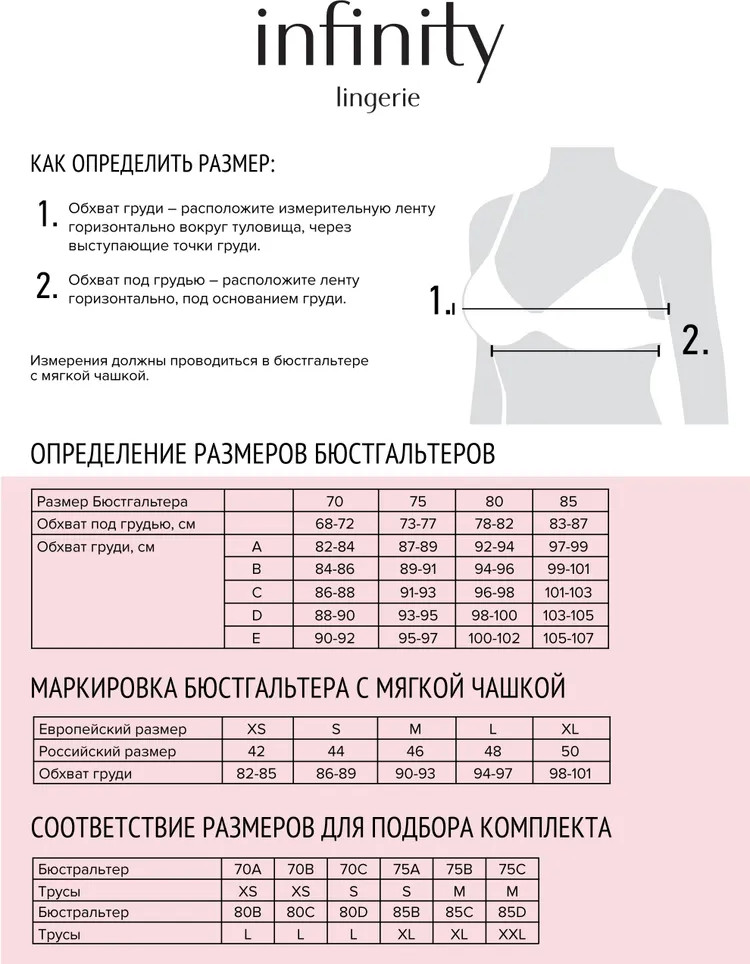 Пошив хороший, бюстгальтер лёгкий, хорошо подойдёт на летний период, под открытые платья, нет ничего лишнего, гладкий, но для молодых и с упругой грудью. Лямочки тоненькие, если грудь большая, тяжёлая, будут врезаться. Регулируются сзади, что для меня тоже не удобно. Поддержка слабая. По моему мнению большемерит. Мне не подошёл ни размер, даже по объему под грудью большой, хотя сверялась с таблицей, ни форма чашек, приплюснутые. К сожалению белье возврату не подлежит. Попробую пристроить дочери, у нее грудь округлая, больше и выше.