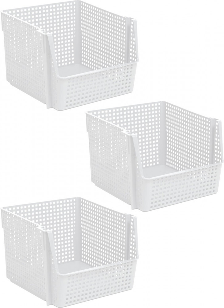 Контейнеры штабелируемые: их можно устанавливать друг на друга без использования крышки благодаря специальной конструкции ящика. Установив несколько корзин друг на друга можно создать удобную систему хранения, своеобразную этажерку или стеллаж с ящиками. При этом пустые ящики удобно хранить — они вставляются друг в друга, обеспечивая компактное хранение.