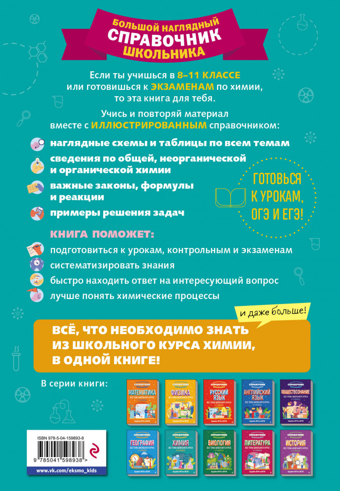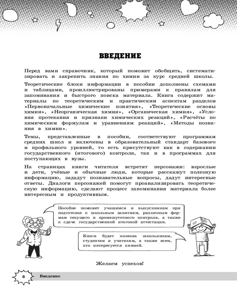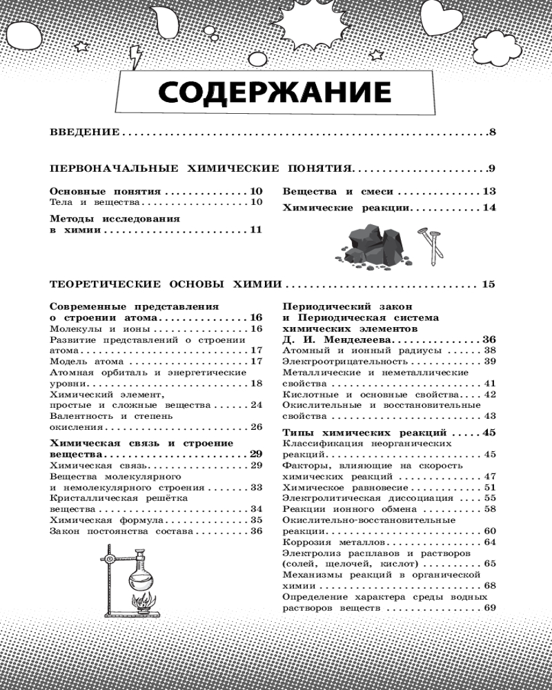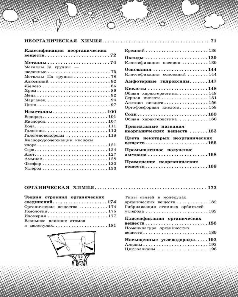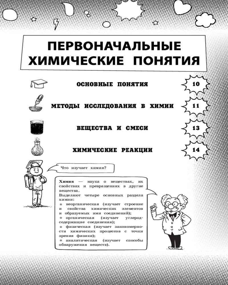 Если вы путаетесь в химических реакциях, понятиях и не можете уложить в голове весь объёмный материал за школьный курс, то это пособие идеально вам подойдёт. В книге нет длинных и скучных текстов — весь материал разбит по коротким рубрикам, таблицам и схемам, которые дополняют иллюстрации. Важная информация подаётся через вопросно-ответную форму с элементами комиксов. Такая форма изложения теории сделает обучение не только эффективным, но и интересным.