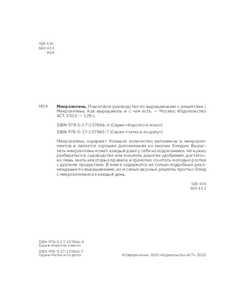 Микрозелень. Пошаговое руководство по выращиванию с рецептамиВ данный момент этот товар отсутствует в продаже. Возможно, у нас найдется аналогичный или похожий товар здесь. Серия: Коротко и ясно Микрозелень содержит большое количество витаминов и микроэлементов и является хорошим дополнением ко многим блюдам. Вырастить микрозелень может каждый даже у себя на подоконнике. Не нужно разбираться в садоводстве или покупать дорогие удобрения, достаточно лишь знать некоторые правила и грамотно сочетать молодые ростки с другими продуктами. В книге содержатся не только подробные рекомендации по выращиванию, но и самые вкусные рецепты простых блюд с микрозеленью на каждый день. |