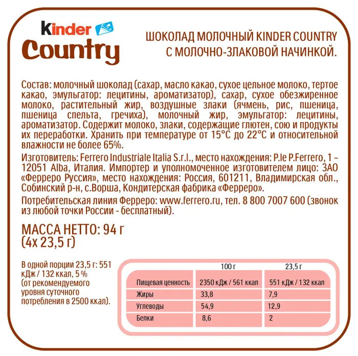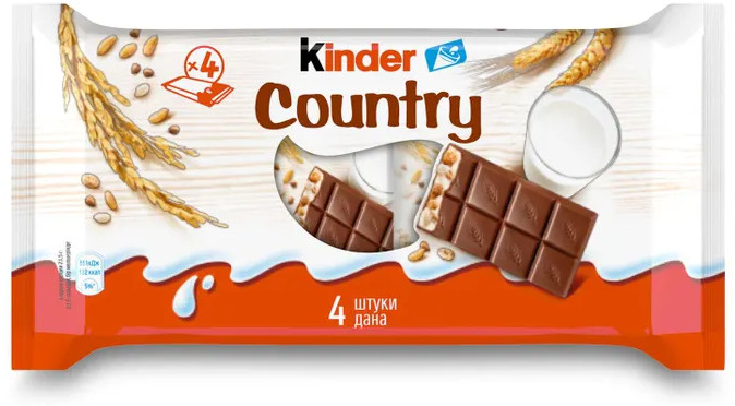 Kinder Шоколад «Country»В данный момент этот товар отсутствует в продаже. Возможно, у нас найдется аналогичный или похожий товар здесь. Kinder Chocolate со злаками — это неповторимое сочетание вкуса великолепного молочного шоколада и нежной молочной начинки с добавлением пяти воздушных злаков. |