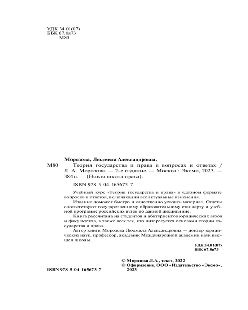 Теория государства и права в вопросах и ответахЛюдмила Александровна Морозова В данный момент этот товар отсутствует в продаже. Возможно, у нас найдется аналогичный или похожий товар здесь. Серия: Новая школа права Учебный курс «Теория государства и права» в удобном формате вопросов и ответов, включающий все актуальные изменения. |