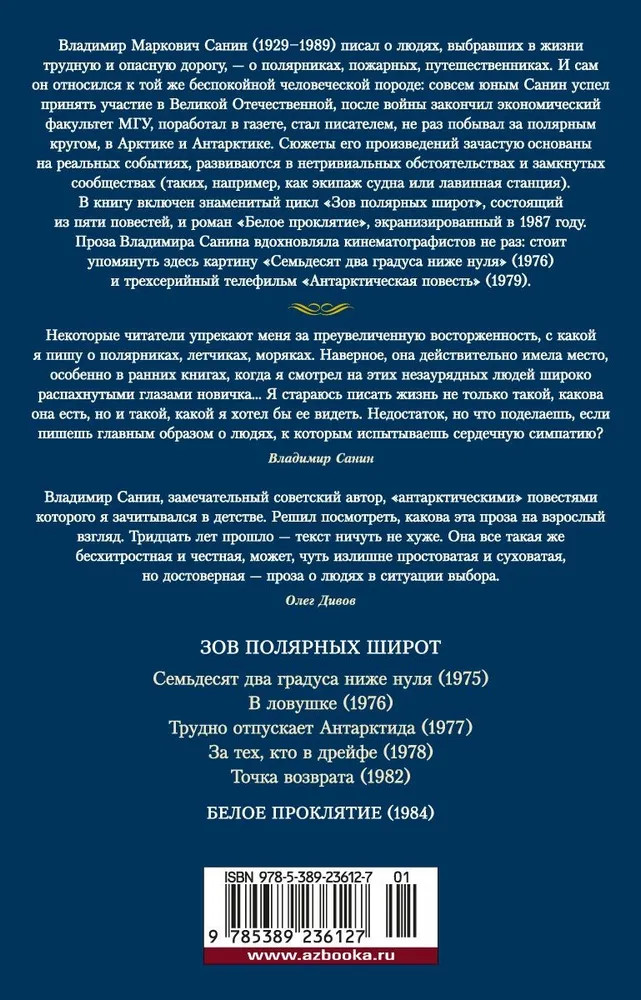 💳 Оплатить за товар можно при получении 🇰🇿 Есть бесплатная доставка по Казахстану 🎁 Копите бонусы с каждой покупки Серия: Русская литература. Большие книги Владимир Маркович Санин (1929-1989) писал о людях, выбравших в жизни трудную и опасную дорогу, — о полярниках, пожарных, путешественниках. И сам он относился к той же беспокойной человеческой породе: совсем юным Санин успел принять участие в Великой Отечественной, после войны закончил экономический факультет МГУ, поработал в газете, стал писателем, не раз побывал за полярным кругом, в Арктике и Антарктике. Сюжеты его произведений зачастую основаны на реальных событиях, развиваются в нетривиальных обстоятельствах и замкнутых сообществах (таких, например, как экипаж судна или лавинная станция). |