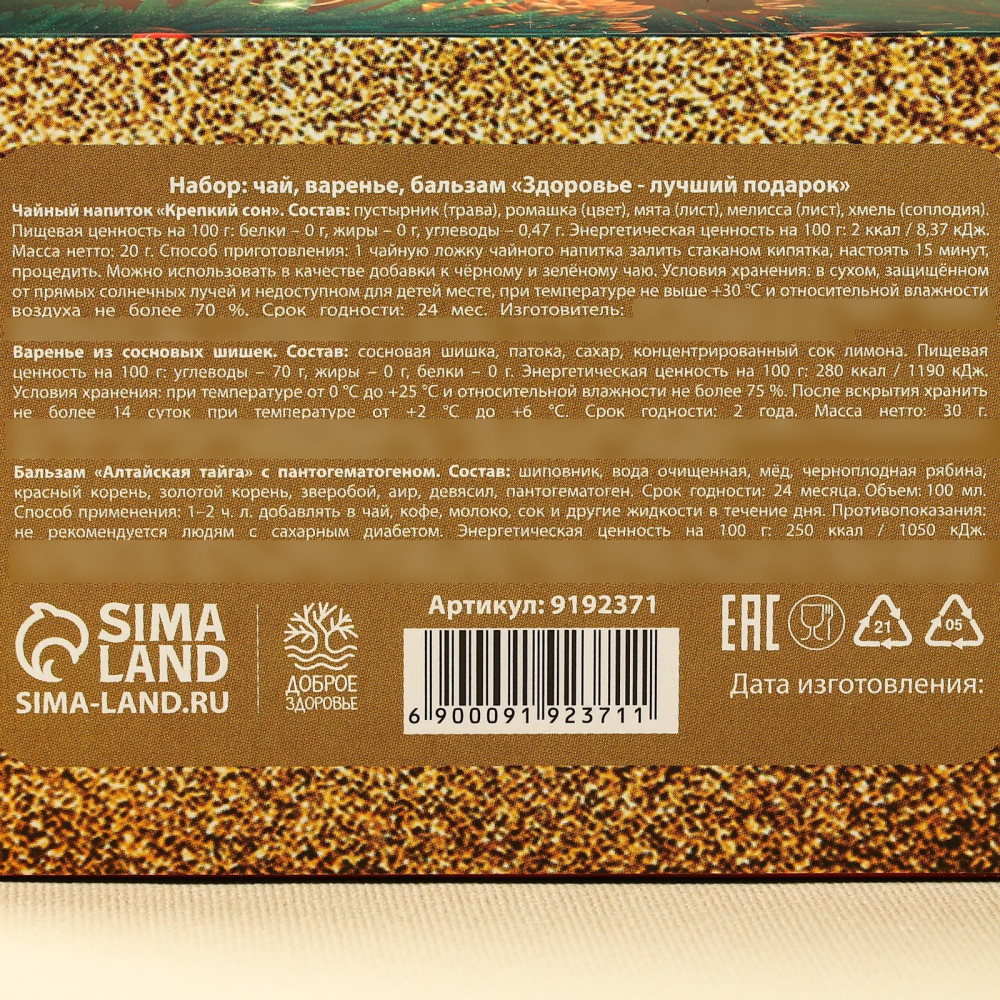 Доброе здоровье Набор «Будьте здоровы»состав вкус В данный момент этот товар отсутствует в продаже. Возможно, у нас найдется аналогичный или похожий товар здесь. Серия: Новогодняя классика Набор «Будьте здоровы» — это идеальный подарок для любого, кто ценит здоровый образ жизни. Набор состоит из натуральных чая, варенья и бальзама, которые помогут поддерживать здоровье и долголетие. Все продукты прошли строгую проверку качества и безопасности. |