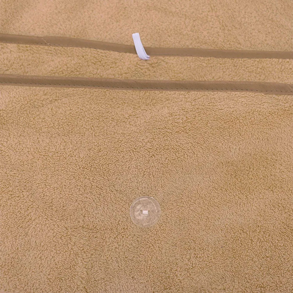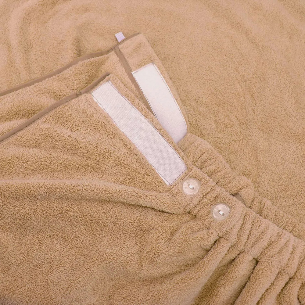 Большое, ниже колен при росте 1.60, очень мягкое, приятное к телу. Липучки надёжные, но есть ещё и дополнительное крепление на пуговицы. Особенно удобно, что они есть и посередине, полотенце не распахивается.