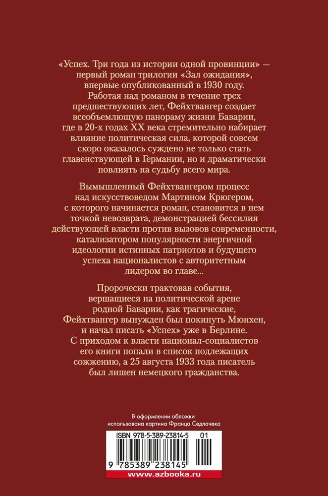 💳 Оплатить за товар можно при получении 🇰🇿 Есть бесплатная доставка по Казахстану от 1 дня 🎁 Копите бонусы с каждой покупки Серия: Иностранная литература. Большие книги «Успех. Три года из истории одной провинции» — первый роман трилогии «Зал ожидания», впервые опубликованный в 1930 году. Работая над романом в течение трех предшествующих лет, Фейхтвангер создает всеобъемлющую панораму жизни Баварии, где в 20-х годах XX века стремительно набирает влияние политическая сила, которой совсем скоро будет суждено не только стать главенствующей в Германии, но и драматически повлиять на судьбу всего мира. Вымышленный Фейхтвангером процесс над искусствоведом Мартином Крюгером, с которого начинается роман, становится в нем точкой невозврата, демонстрацией бессилия действующей власти против вызовов современности, катализатором популярности энергичной идеологии истинных патриотов и будущего успеха националистов с авторитетным лидером во главе... Пророчески трактуя события, вершащиеся на политической арене родной Баварии, как трагические, Фейхтвангер вынужден был покинуть Мюнхен и начал писать «Успех» уже в Берлине. С приходом к власти национал-социалистов его книги попали в список подлежащих сожжению, а 25 августа 1933 года писатель был лишен немецкого гражданства. |