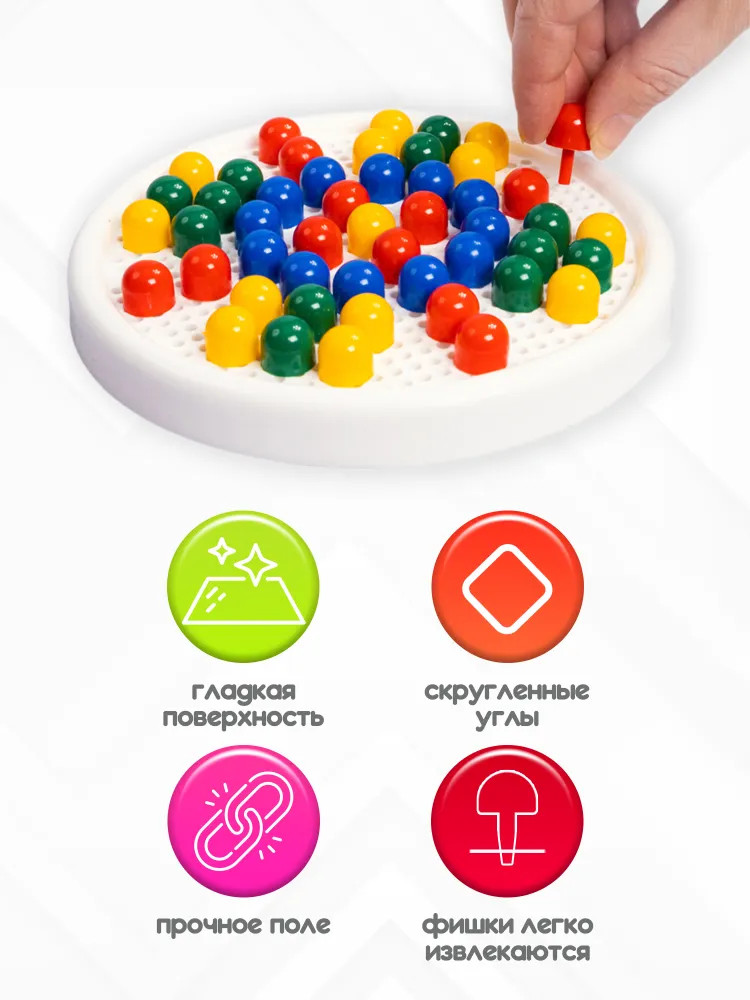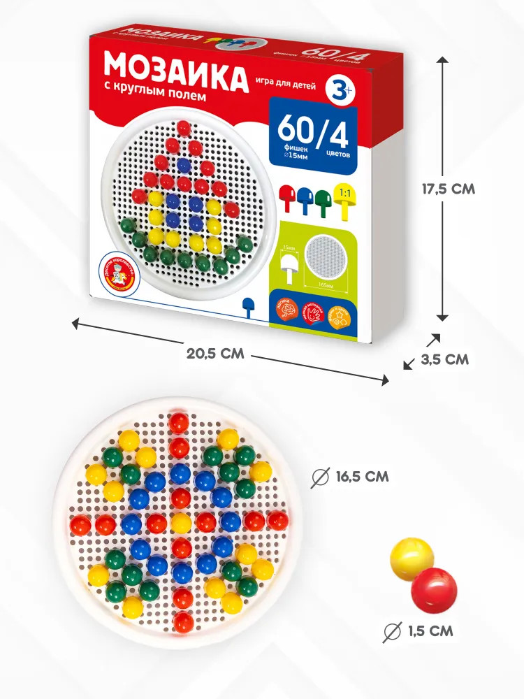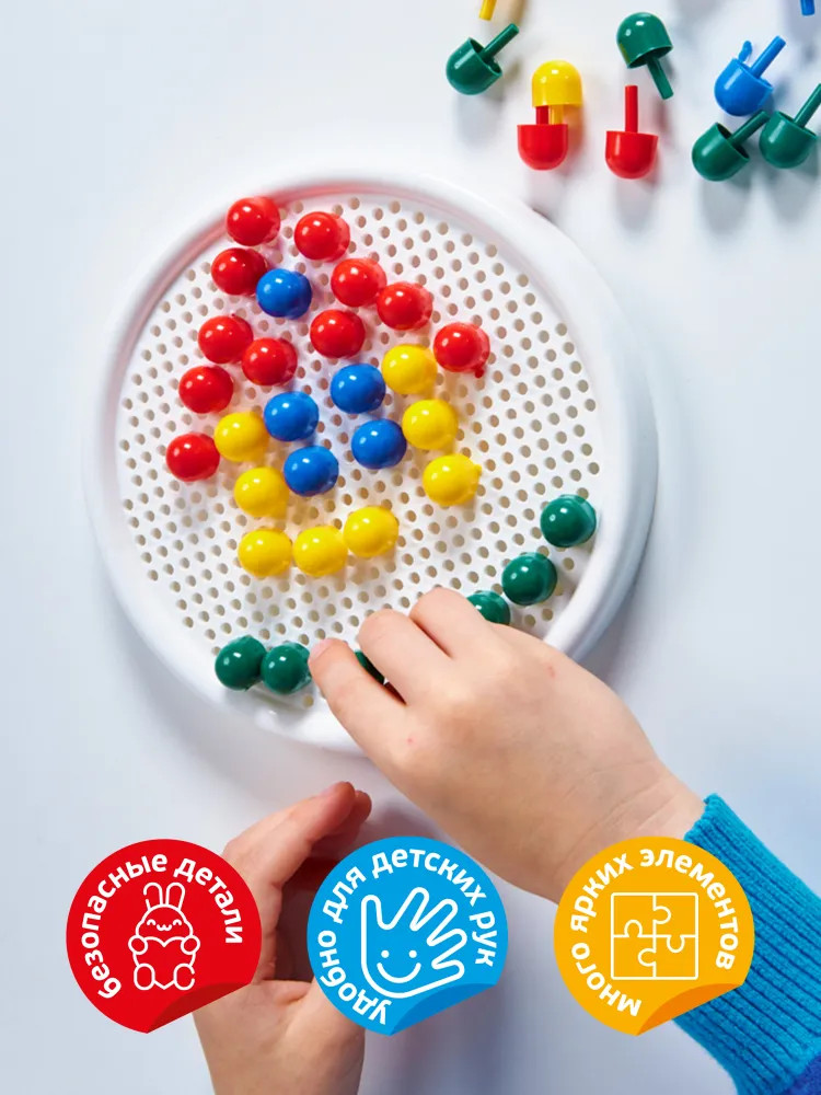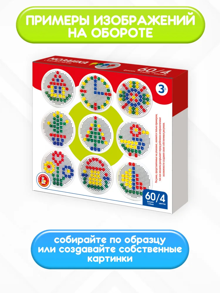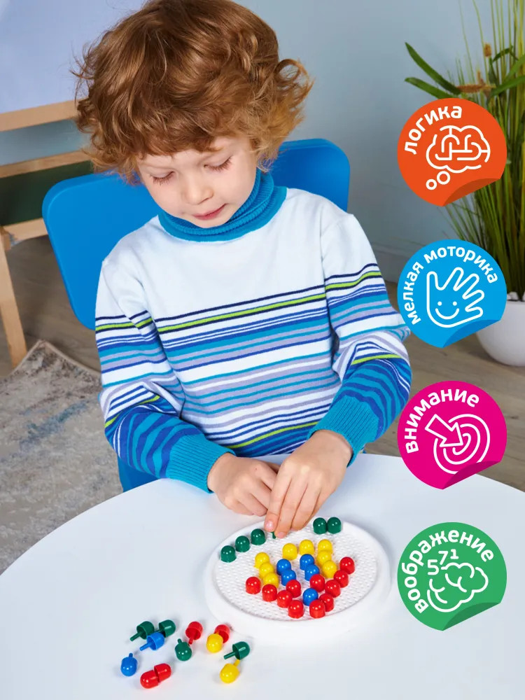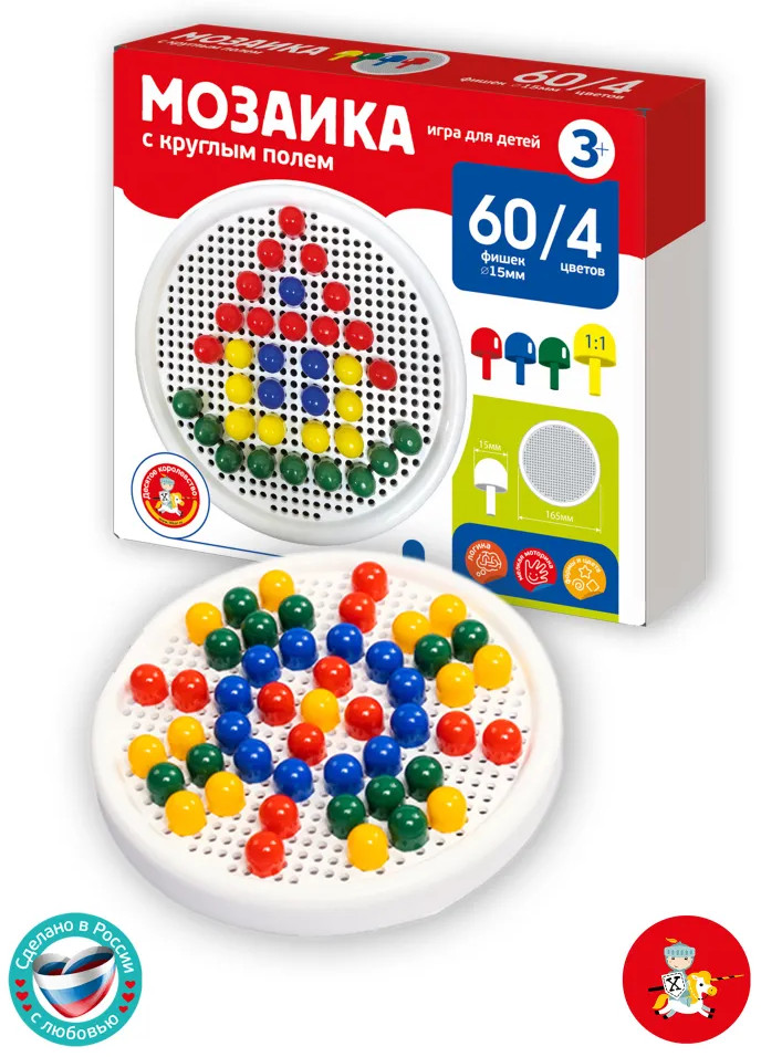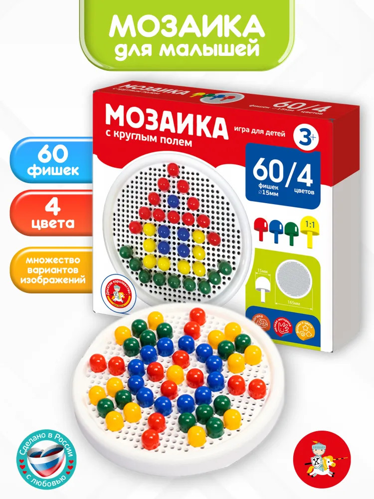 💳 Оплатить за товар можно при получении 🇰🇿 Есть бесплатная доставка по Казахстану от 1 дня 🎁 Копите бонусы с каждой покупки Детская мозаика с круглым полем (60 элементов) — это увлекательная игра и замечательная возможность для развития творческой фантазии, аккуратности и точности пальчикового захвата вашего малыша. Для сюжетов воспользуйтесь рисунками, размещенными на упаковках, или же придумывайте и создавайте свои собственные уникальные произведения! Фишки изготовлены из качественного пластика, не имеющего запаха. Поверхность фишек гладкая, благодаря чему игра будет безопасной для ребёнка. Собирая элементы мозаики в единую картину, ребёнок развивает воображение, внимательность и логику, тренирует мелкую моторику рук и учится различать цвета. |