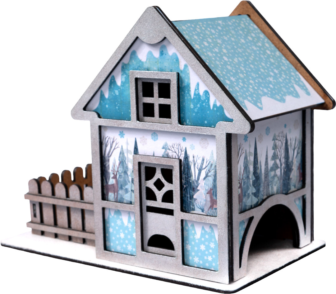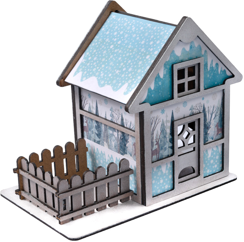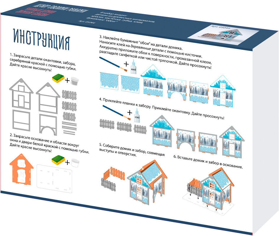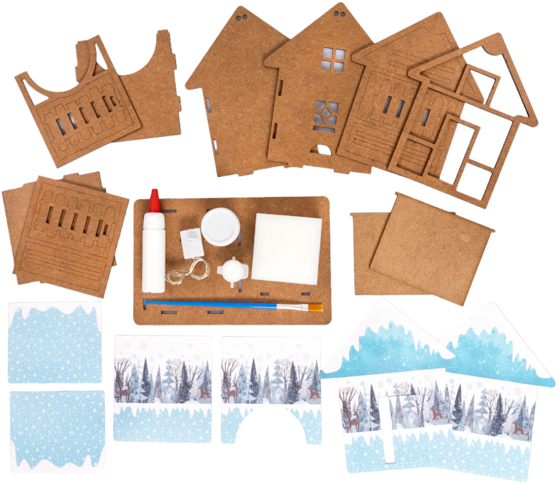 Комплектация набора: детали из древесного материала, краски акриловые на водной основе (серебряная и белая) — 2 шт., кисточка — 1 шт., клей ПВА — 1 шт., губка — 1шт., электрическая гирлянда — 1 шт., обои для декора.