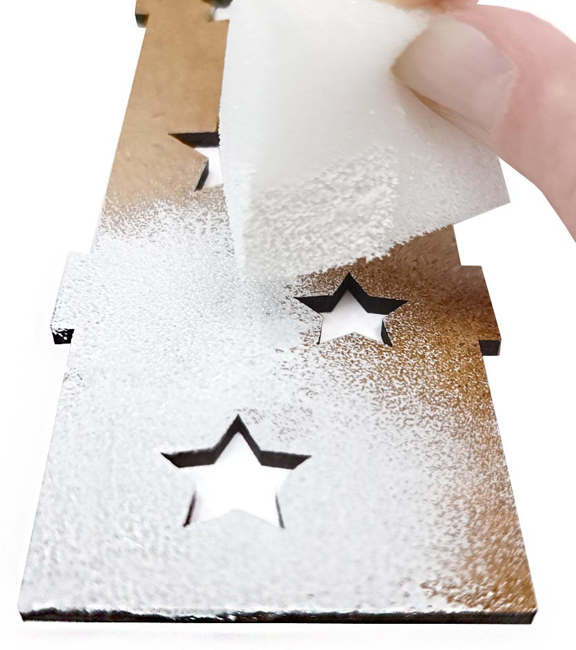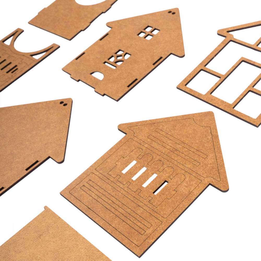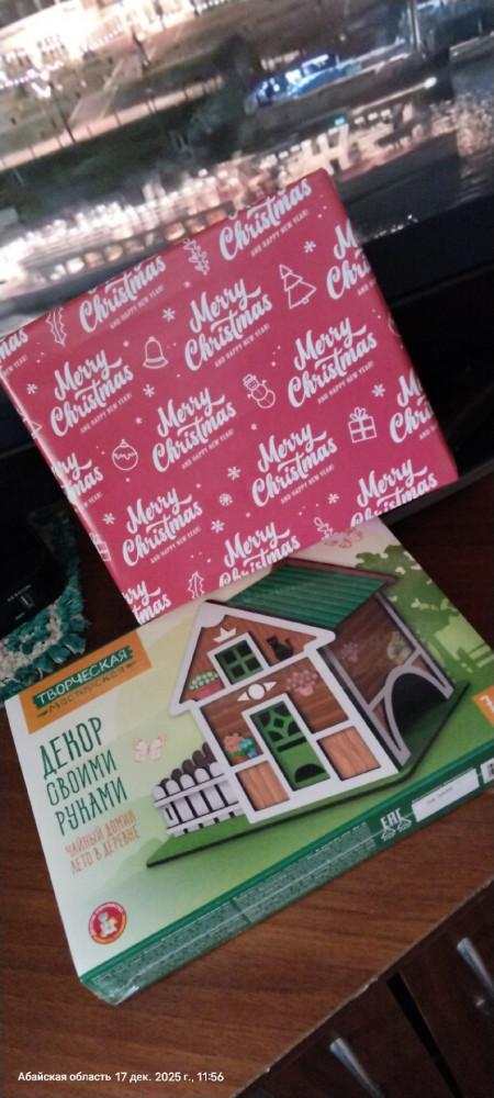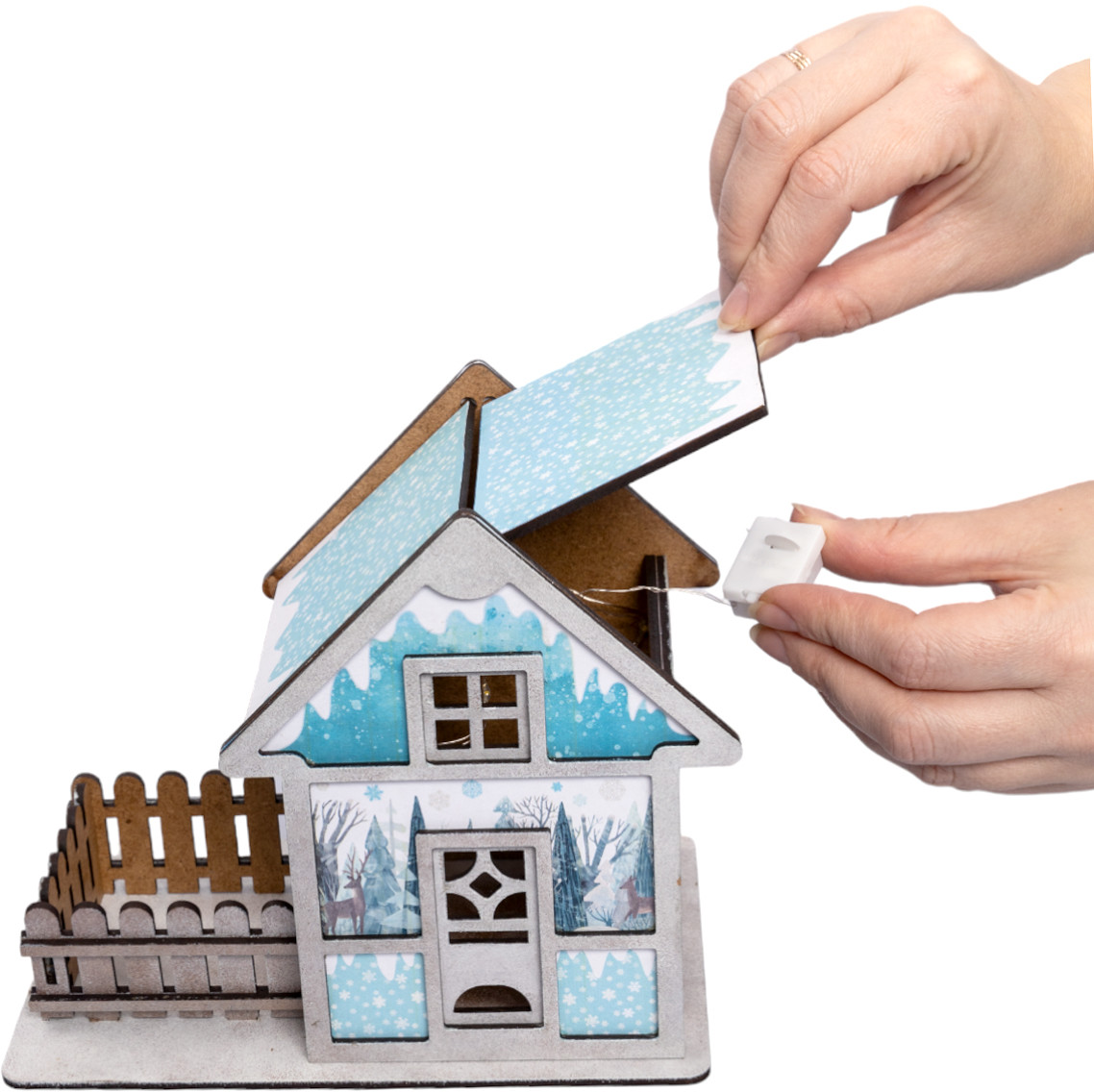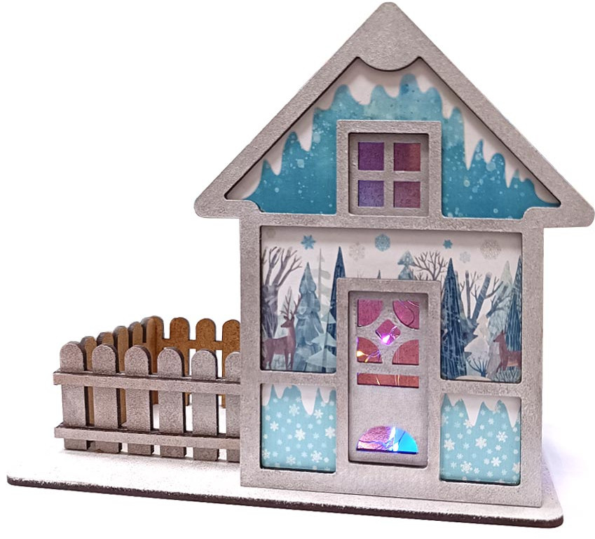 Комплектация набора: детали из древесного материала, краски акриловые на водной основе (серебряная и белая) — 2 шт., кисточка — 1 шт., клей ПВА — 1 шт., губка — 1шт., электрическая гирлянда — 1 шт., обои для декора.