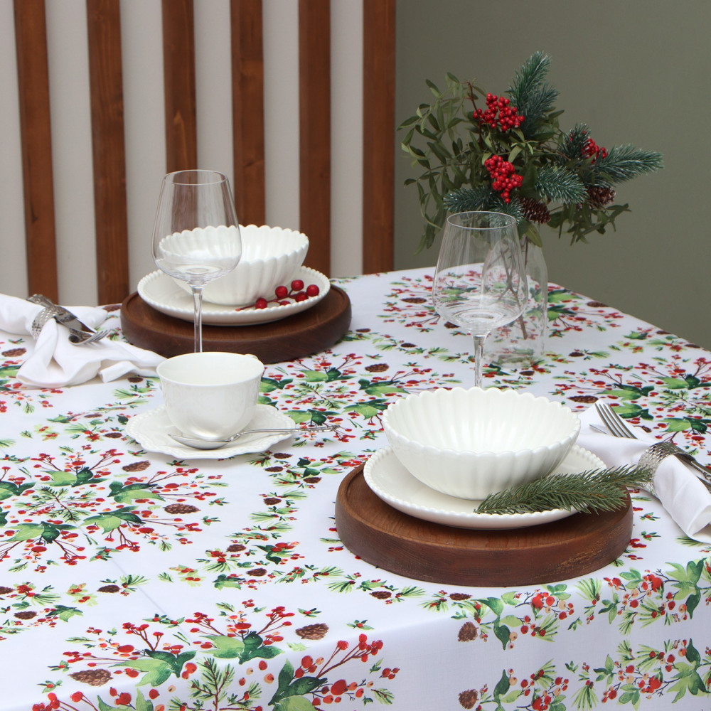 Очень тоненькая и легкая. Брала ее для обеденного стола, для повседневного использования. Пришлось постелить сверх х/б скатерти, чтобы не скользила.