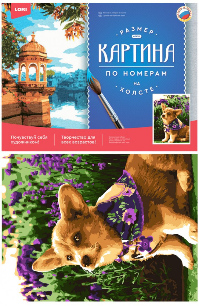 Комплектация: холст на деревянном подрамнике с контуром, акриловые краски, кисть, вспомогательный лист, акриловый лак.