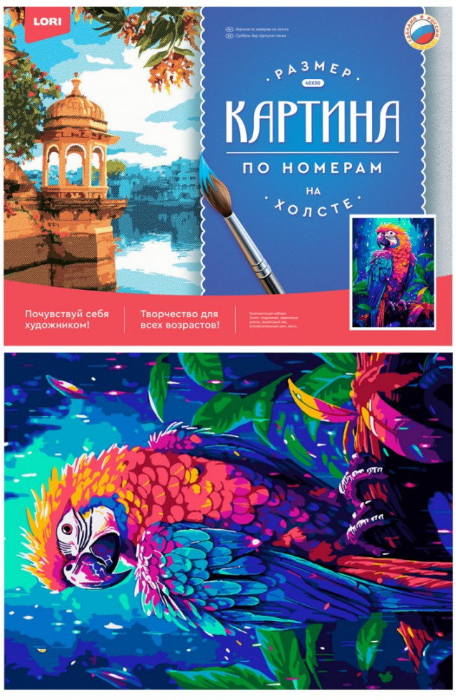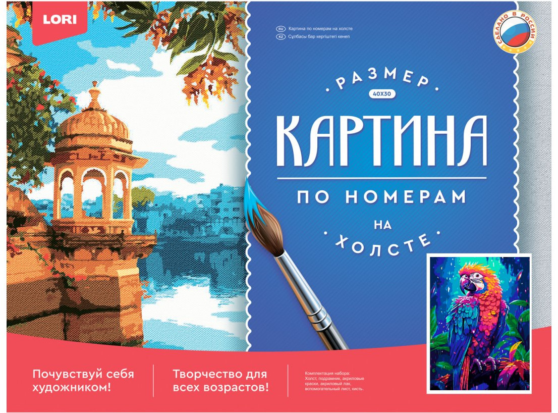 Комплектация: холст на деревянном подрамнике с контуром, акриловые краски, кисть, вспомогательный лист, акриловый лак.