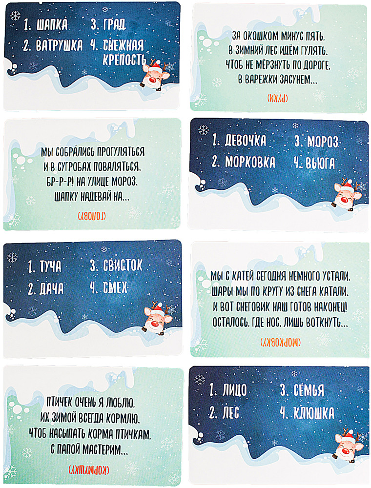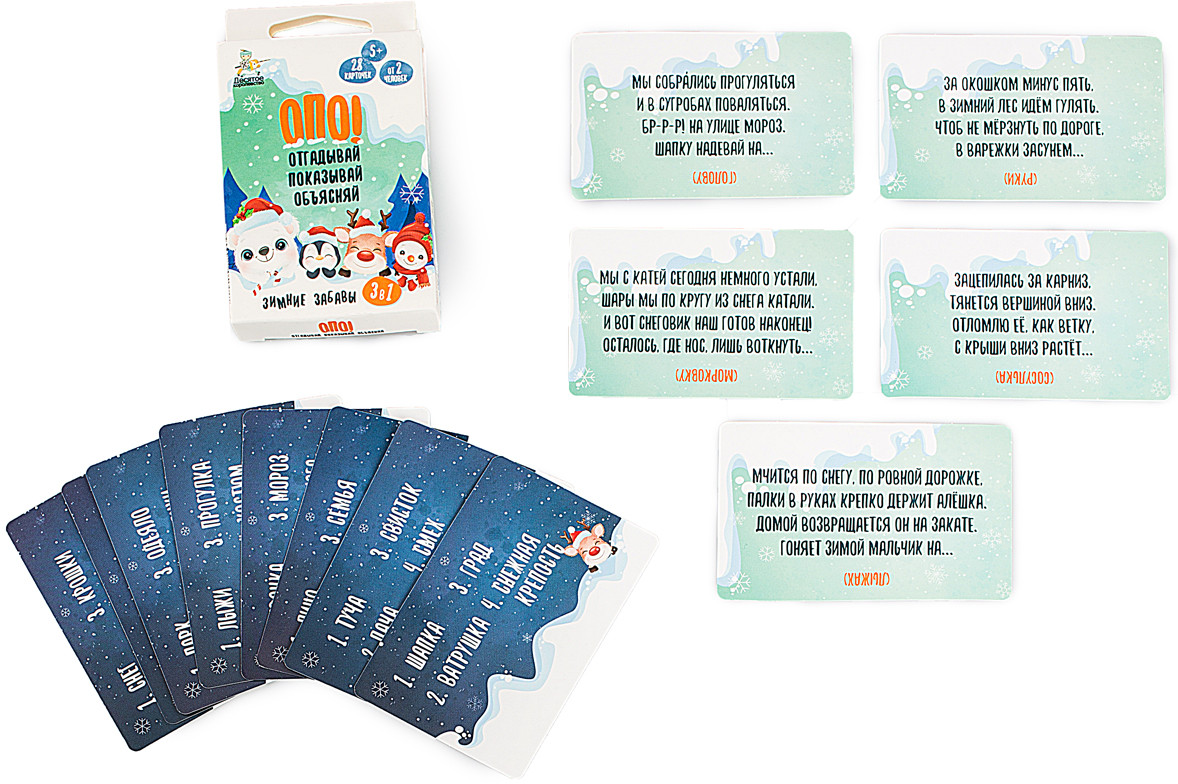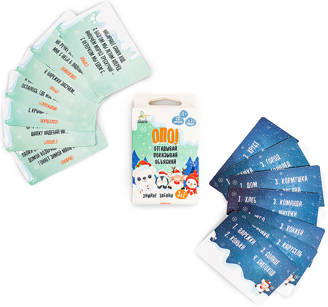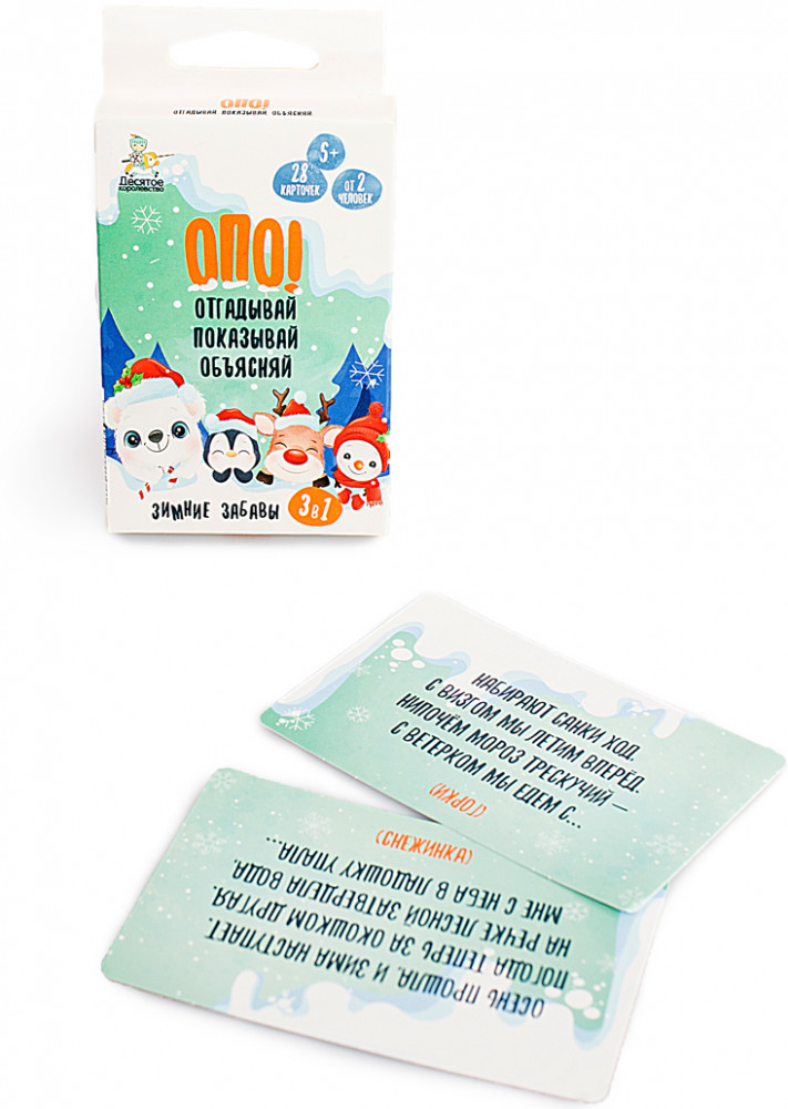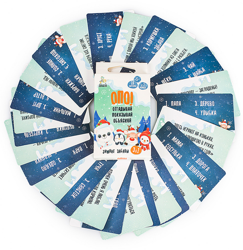 💳 Оплатить за товар можно при получении 🇰🇿 Есть бесплатная доставка по Казахстану 🎁 Копите бонусы с каждой покупки Настольная игра для детей «Опо! Зимние забавы» Отгадывай. Показывай. Объясняй. — это сразу три игры в одной коробочке. В игре могут участвовать от 2 игроков и более. Рекомендовано для детей старше 5 лет. |