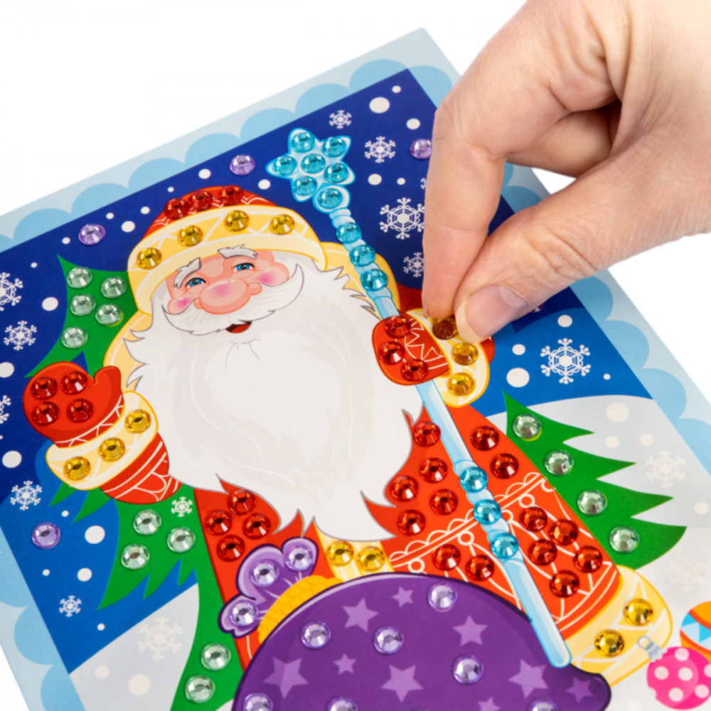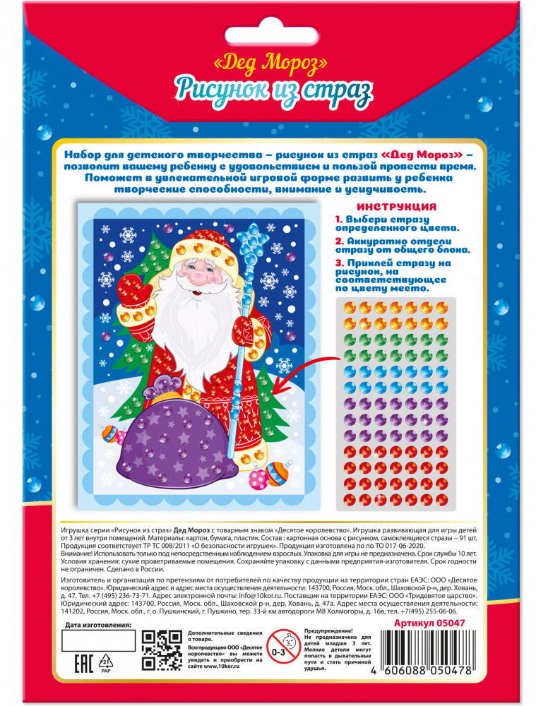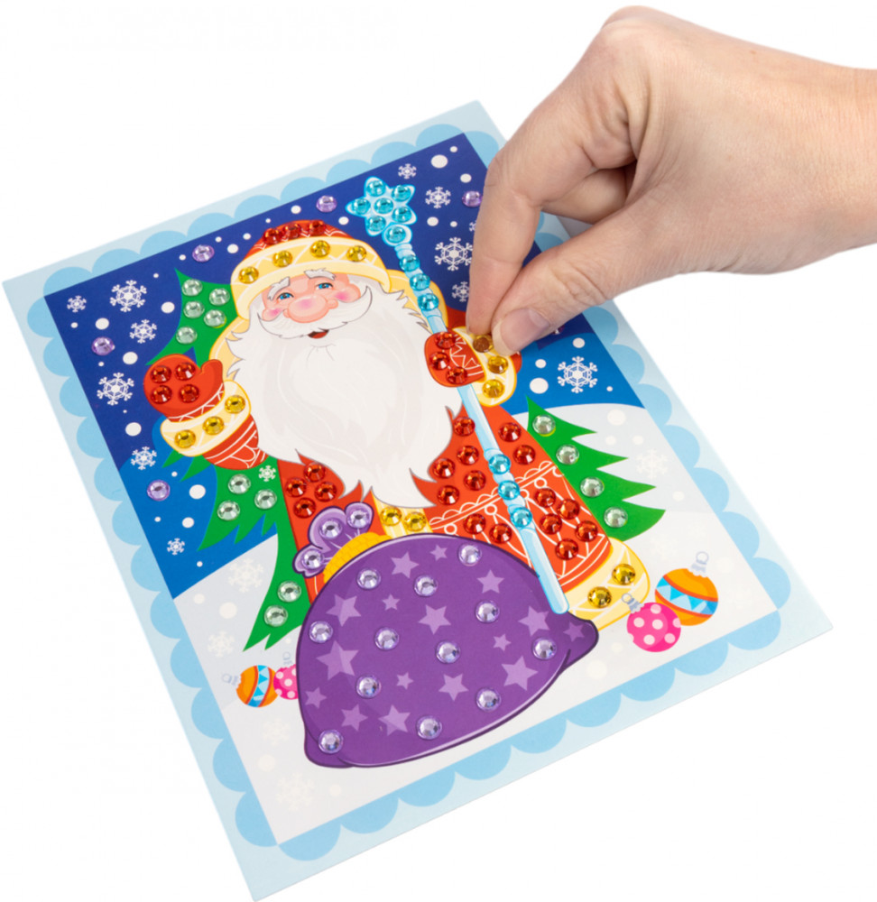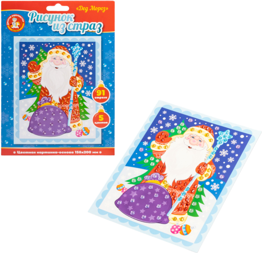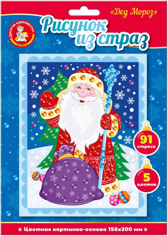 Десятое королевство Картина из страз «Дед Мороз»В данный момент этот товар отсутствует в продаже. Возможно, у нас найдется аналогичный или похожий товар здесь. С помощью детского набора «Дед Мороз» ребенок создаст волшебное новогоднее настроение, оживив картинку яркими разноцветными стразами. Картинку можно подарить другу или украсить ей комнату. Выкладывание страз по рисунку, со специально отмеченными для них местами, не только развивает мелкую моторику, усидчивость, образное мышление, но и само по себе является очень интересным и увлекательным занятием. Учитывая то, что стразы блестящие, яркие, небольшие (диаметр 6 мм), они легко могут оказаться во рту, поэтому считаем контроль со стороны взрослых обязательным! Выберите стразу определённого цвета и аккуратно отделите от общего блока. Затем аккуратно приклейте на рисунок, на соответствующий по цвету кружок. |