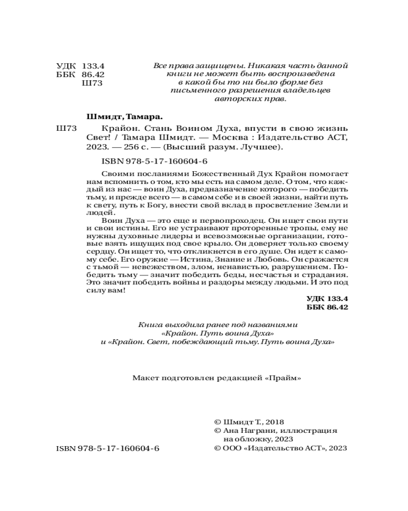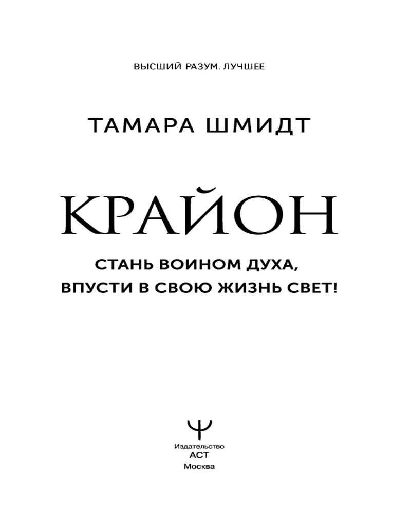 В данный момент этот товар отсутствует в продаже. Возможно, у нас найдется аналогичный или похожий товар здесь. Серия: Высший разум. Лучшее В этой книге Тамары Шмидт — одного из самых известных ченнелеров России, собраны удивительные послания Крайона, в которых он с любовью обращается ко всем нам — Воинам Света, первопроходцам, ступившим на непростой путь борьбы с Тьмой и исполняющим свое предназначение.
