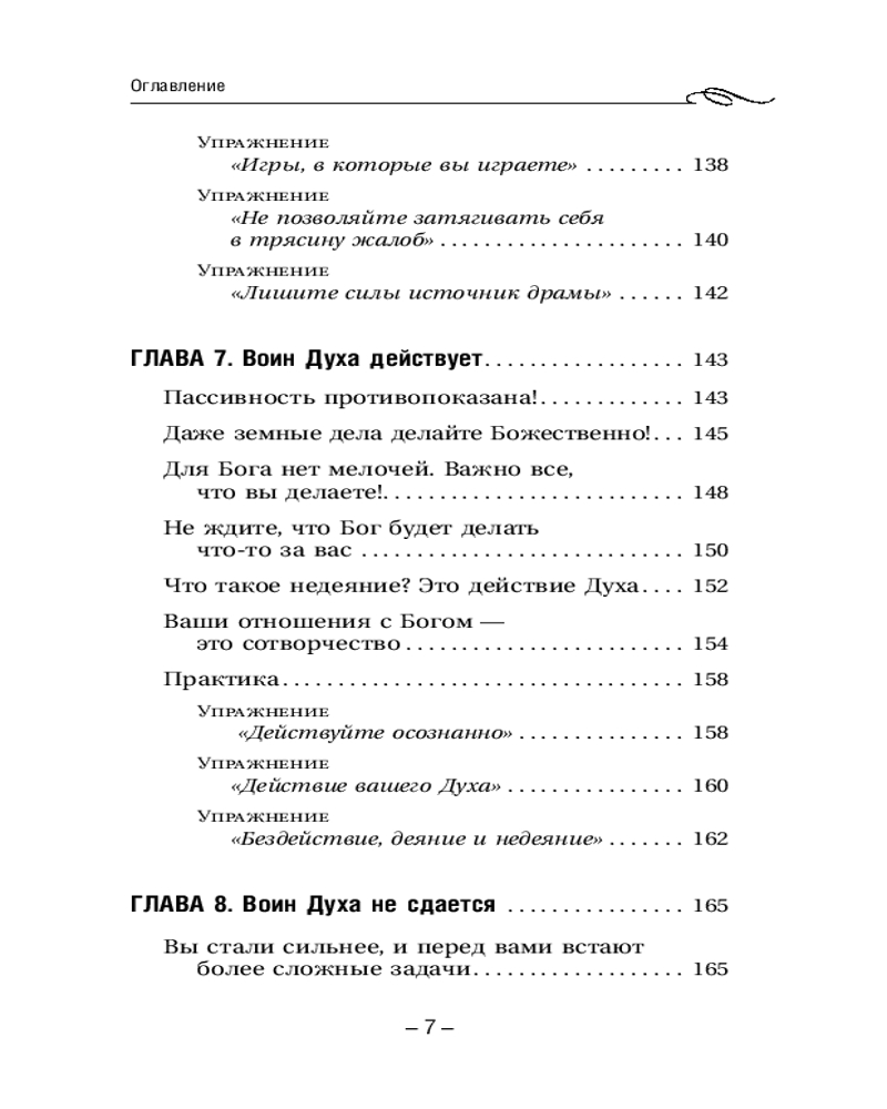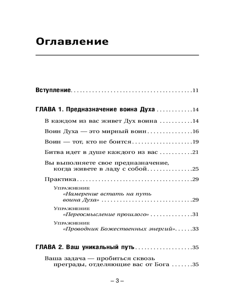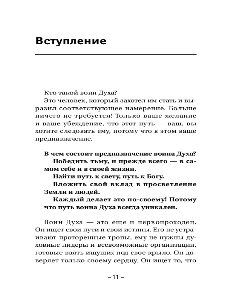 Воин Духа — это не воин в традиционном человеческом понимании. Воин Духа — это не тот, кто борется, идет напролом, убивает и сам рискует быть убитым в схватках не на жизнь, а на смерть. Воин Духа не втягивается в схватки в привычном для вас смысле слова, и, уж конечно, он никого не убивает. Воин Духа — это мирный воин. Его оружие — свет и любовь Бога. Его сражения — мирные. В них нет жертв. Эти сражения в конечном итоге направлены на наивысшее благо для всех.