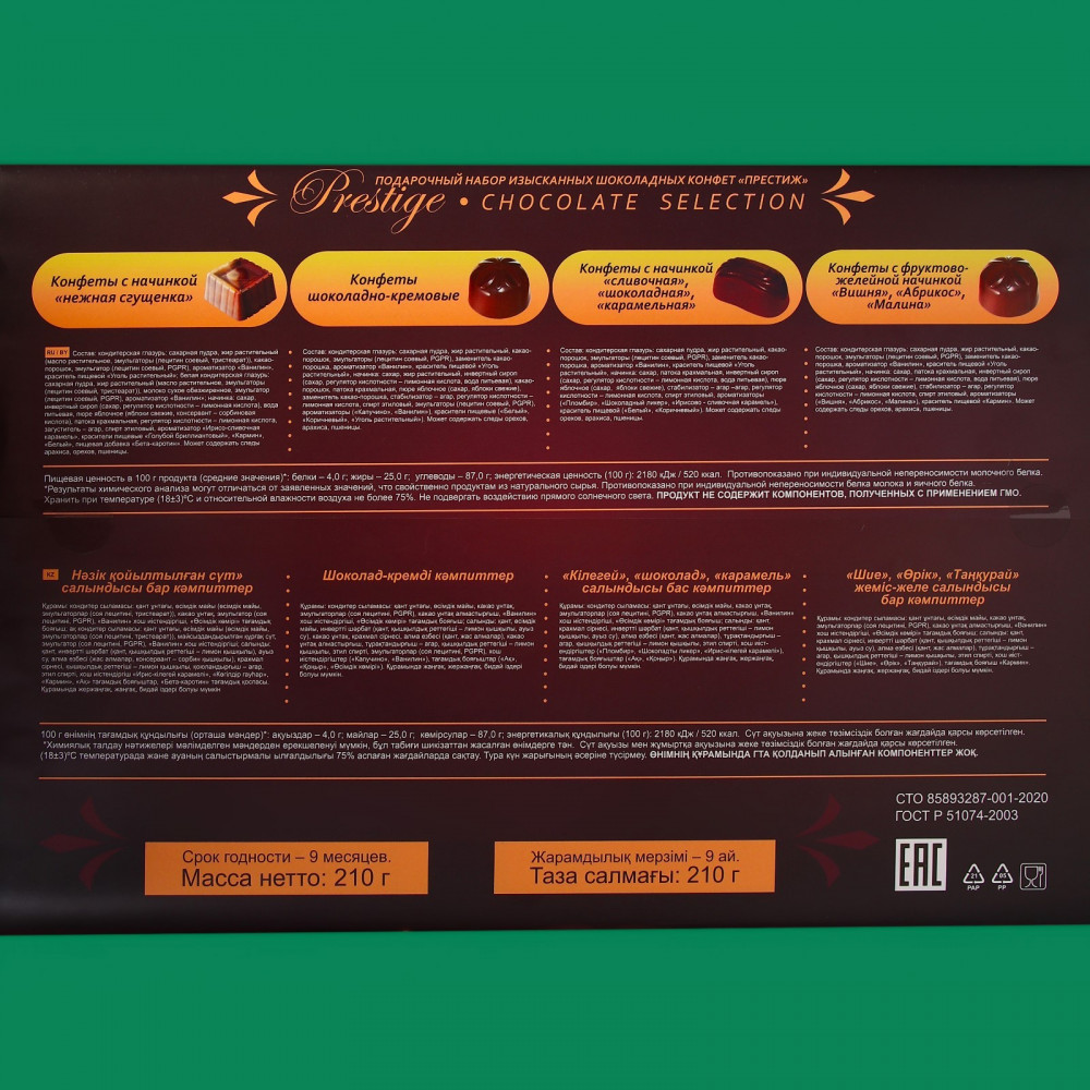 • конфеты с начинкой «Нежная сгущёнка»: сахар, сахарная пудра, масло растительное, эмульгаторы (лецитин соевый, тристеарат, PGPR), ароматизаторы (ванилин, ирисо-сливочная карамель), краситель пищевой (уголь растительный, кармин, белый, голубой-бриллиантовый), молоко сухое обезжиреное, инвертный сироп, регулятор кислотности (лимонная кислота), вода питьевая, консервант (сорбиновая кислота), патока крахмальная, загуститель (агар), спирт этиловый, пищевая добавка (бета-каротин). Может содержать следы арахиса, орехов, пщеницы.