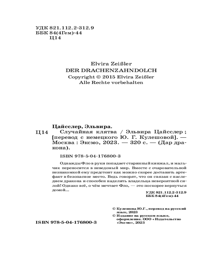 |  | Случайная клятва    	Эльвира Цайсслер В данный момент этот товар отсутствует в продаже. Возможно, у нас найдется аналогичный или похожий товар здесь .Серия: Дар дракона Книга для тех, кто обожает истории о волшебных мирах. Пятнадцатилетний подросток пытается понять, как именно он связан с древним наследием дракона.