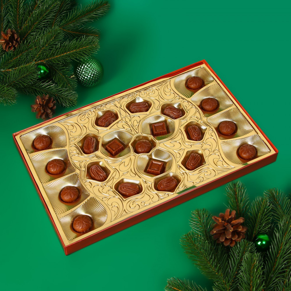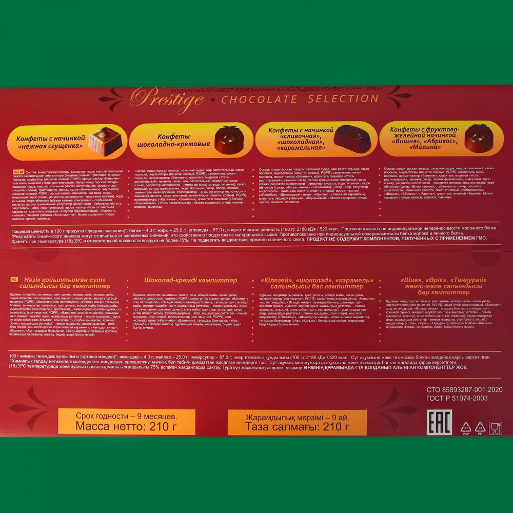 • конфеты с фруктово-желейной начинкой «Вишня», «Абрикос», «Малина»: сахар, сахарная пудра, жир растительный, какао-порошок, эмульгаторы (лецитин соевый, PGPR), заменитель какао-порошка, ароматизаторы (ванилин, вишня, абрикос, малина), краситель пищевой (уголь растительный, кармин), патока крахмальная, вода питьевая, пюре яблочное, стабилизатор (агар), регулятор кислотности (лимонная кислота), спирт этиловый. Может содержать следы арахиса, орехов, пшеницы.